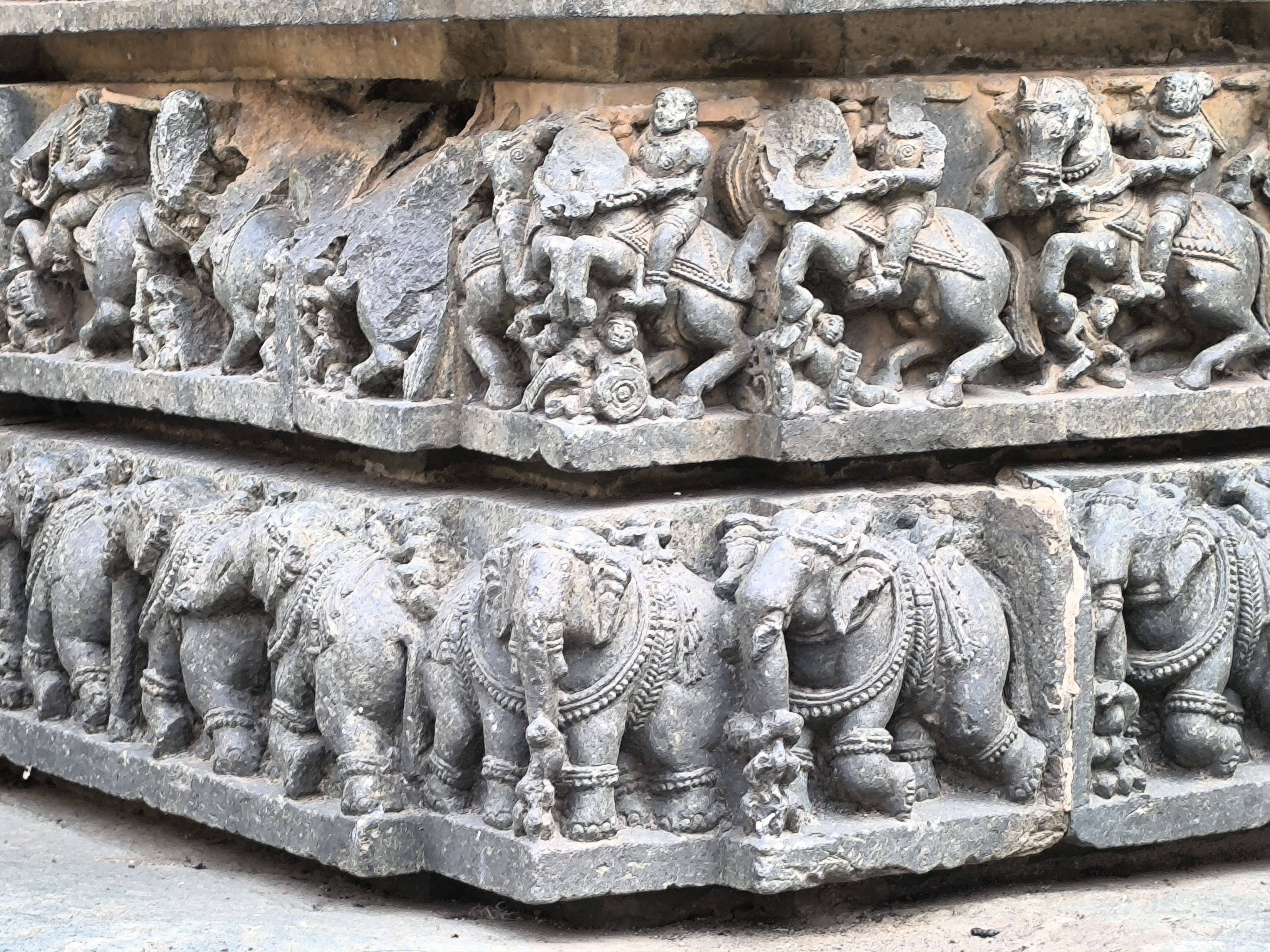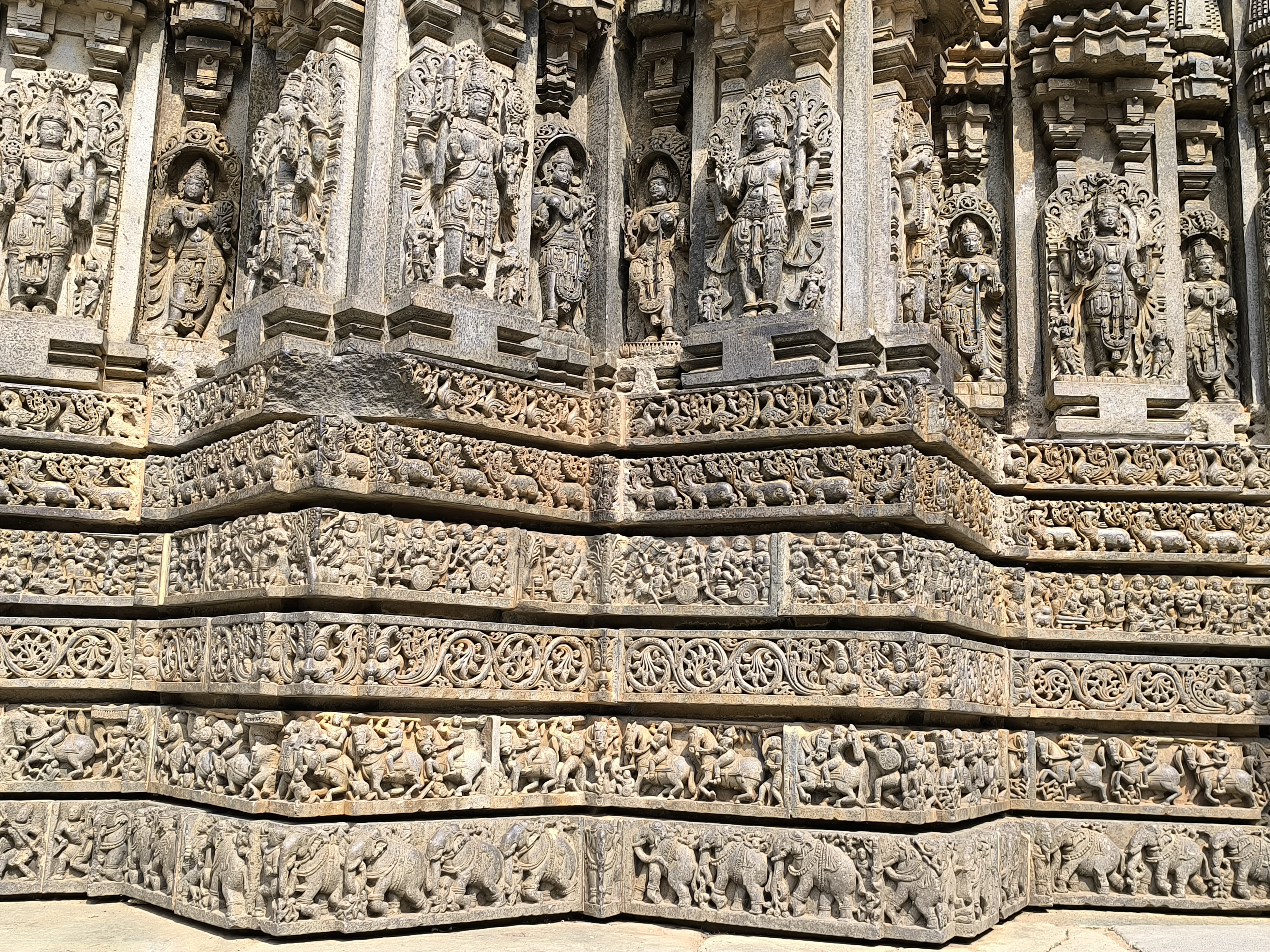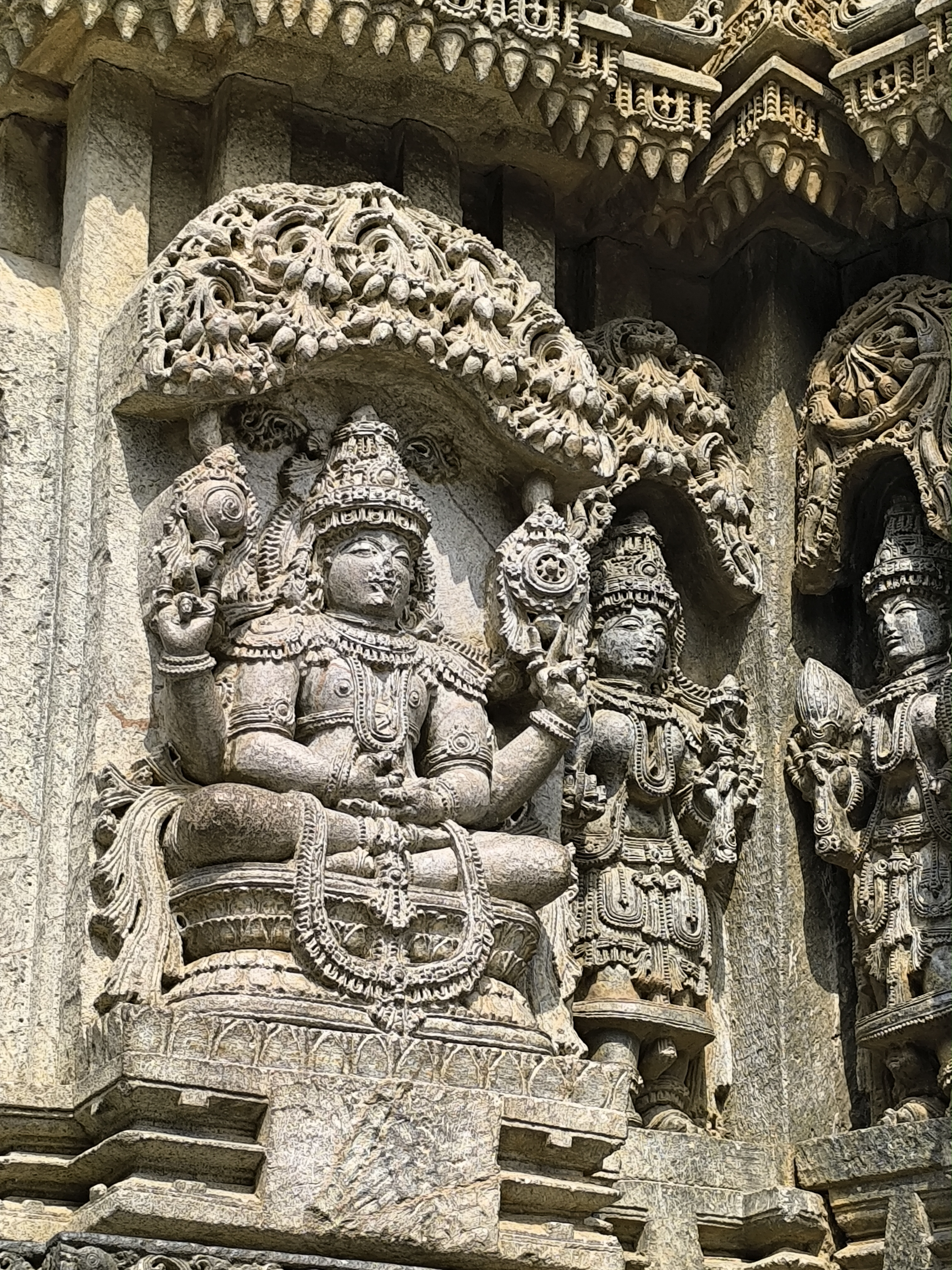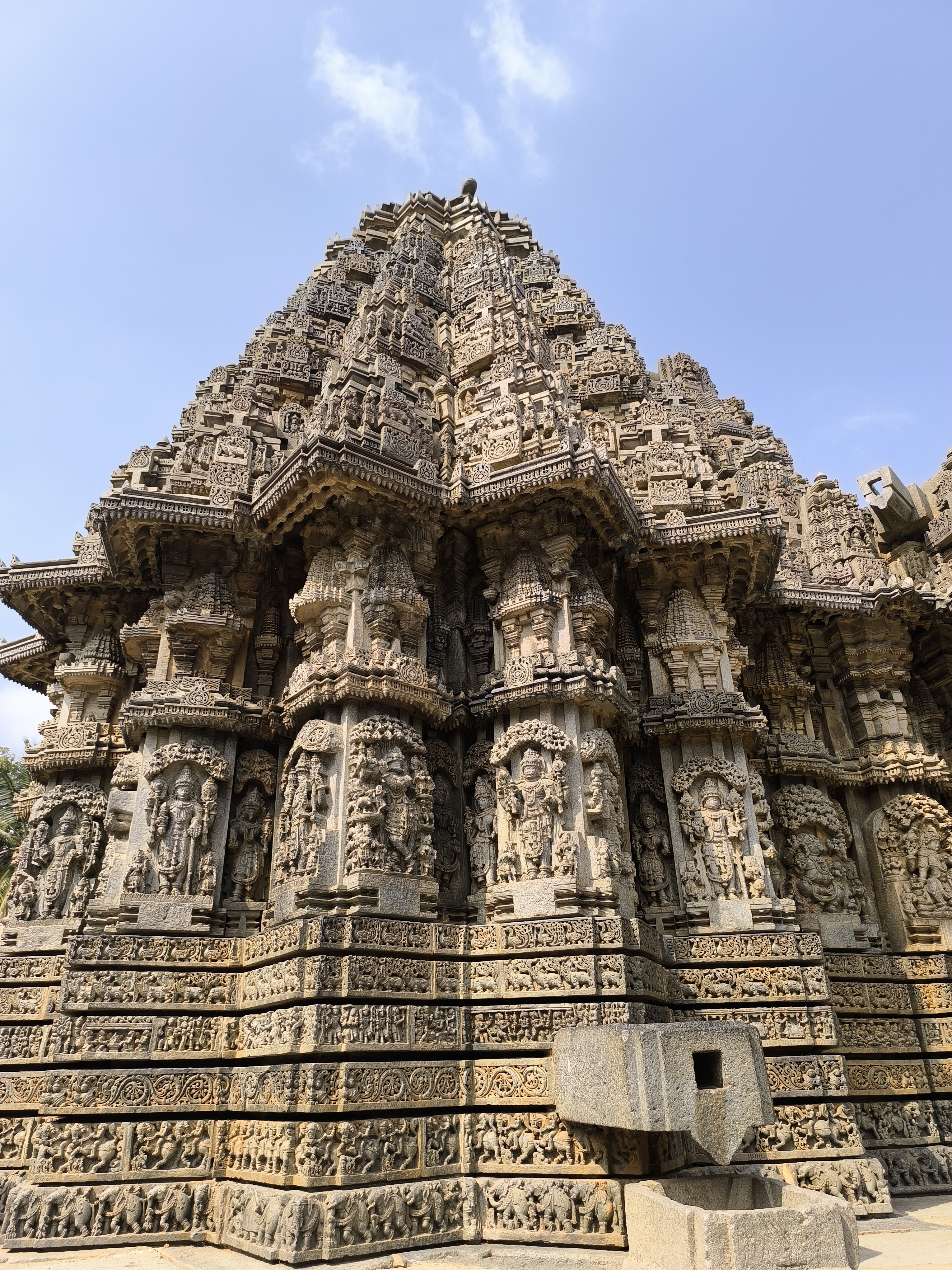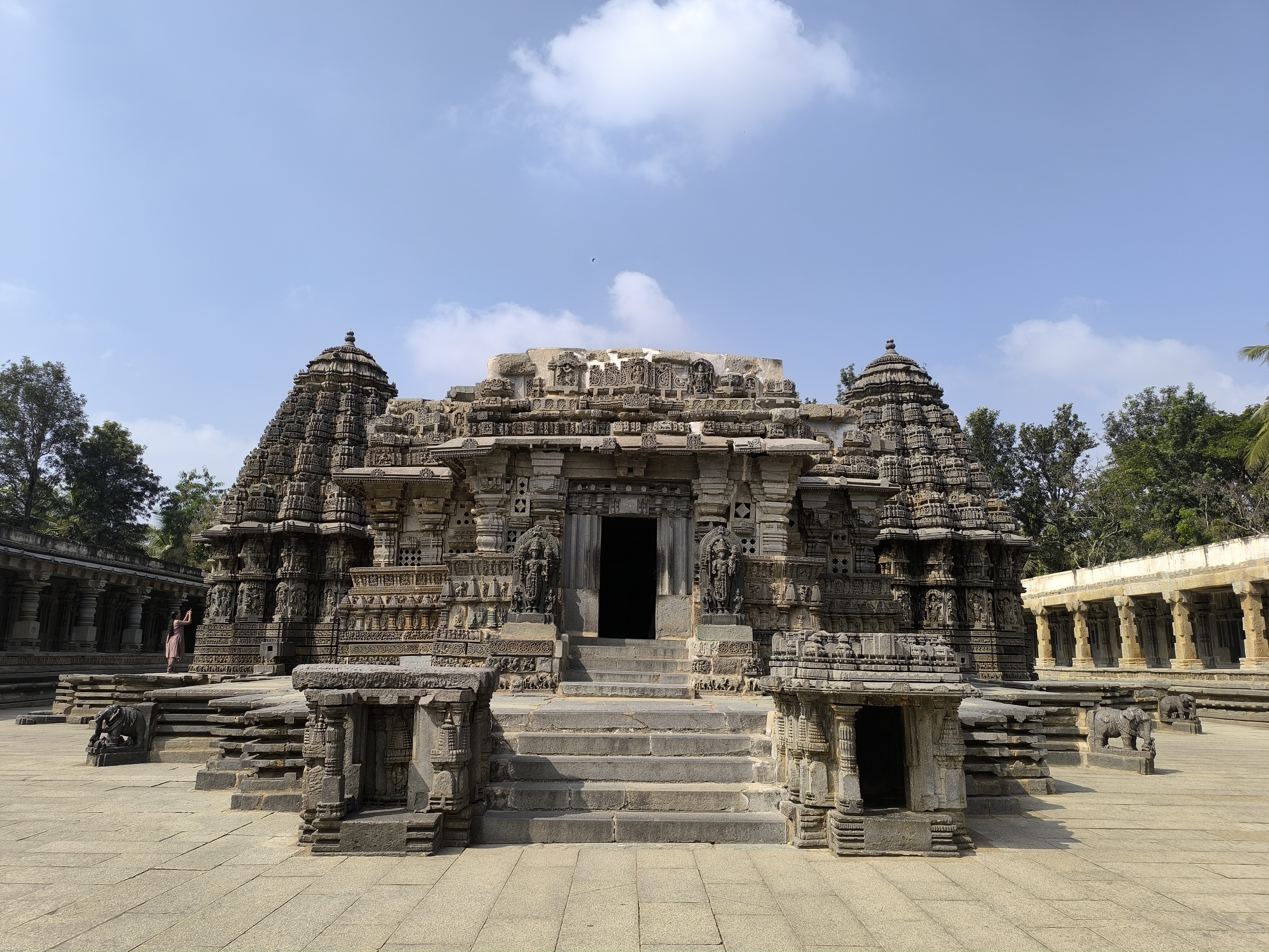 Dann ging's durch die schöne Anlage zum Tempel und der verschlug uns den Atem. Das Bauwerk wurde 1268 in Auftrag gegeben und ist wohl das letzte der Hoysala - Periode und zugleich deren Meisterwerk. Der Tempel an sich ist eine einzige Skulptur und nahezu unbeschädigt. Die Haupthalle wird von 18 Hauptsäulen getragen, die wie gedrechselt aussehen und hat nach Westen, Norden und Süden drei Schreine, die Vishnu und Shiva in verschiedenen Erscheinungsformen gewidmet sind.