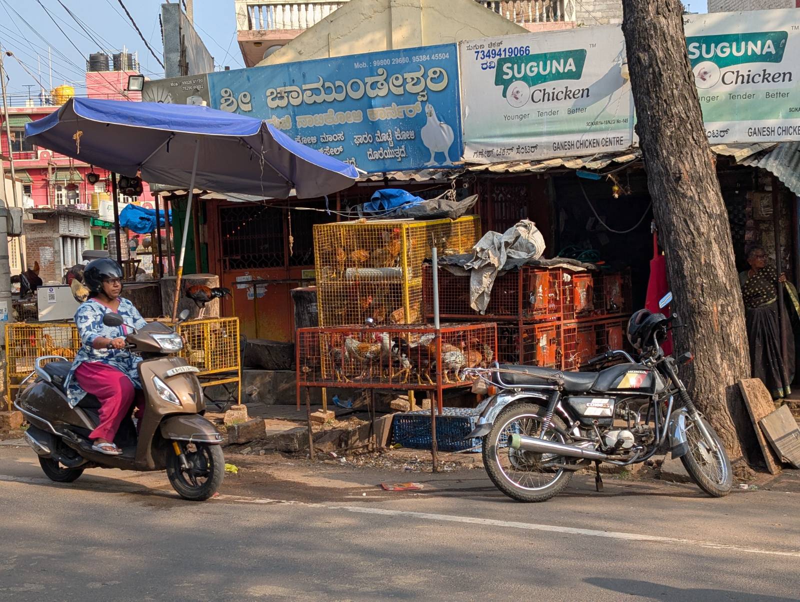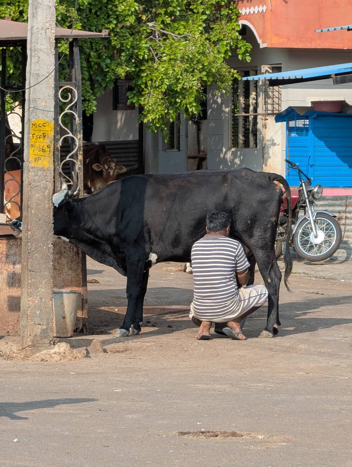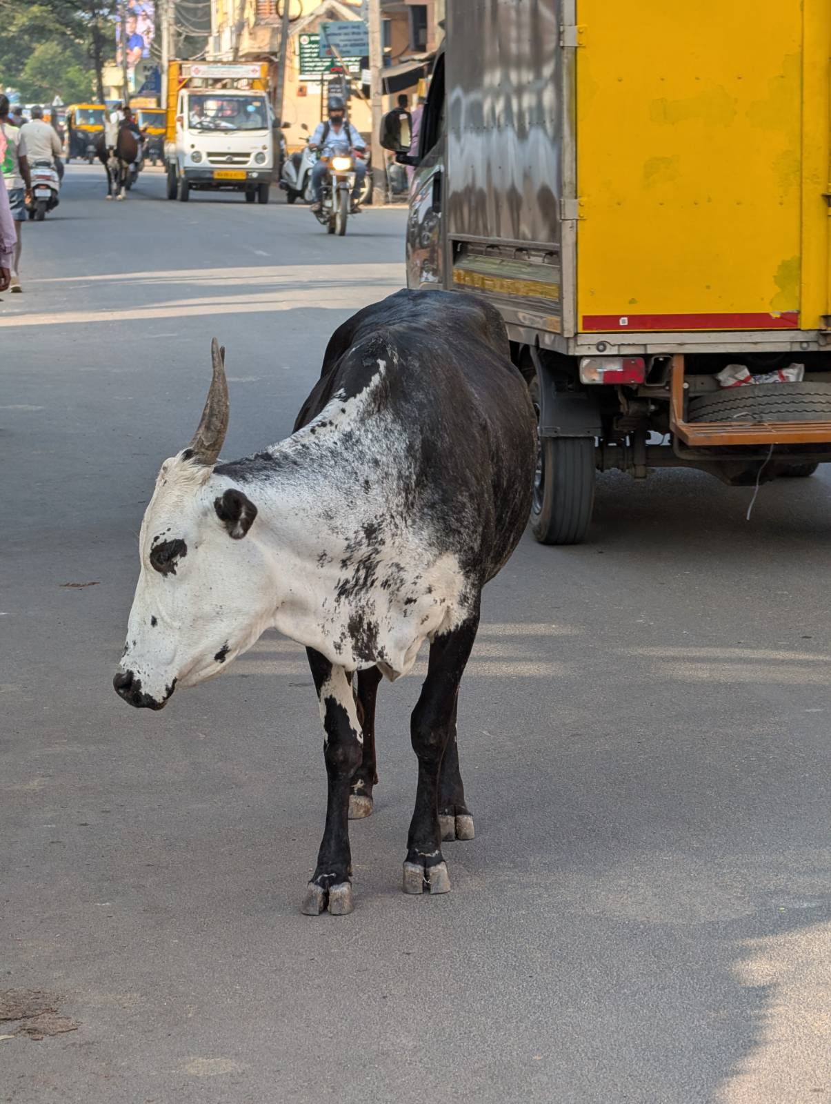 Gestern bummelten wir drei Stunden durch Mysore. Unter "Bummeln" versteht Günther: Gehen auf einem oft nicht vorhandenen Gehsteig (man muss gut aufpassen - plötzlich ist da ein Loch, oder es liegt ein Betonmast quer am Boden, oder ACHTUNG: Kuhfladen am Weg .... das Auf- und Absteigen bei abzweigenden kleinsten Straßen und dazu dann noch die Überlegungen: gehen wir da über die Straße oder lassen wir es, oder vielleicht woanders, wo weniger Autos, Tuktus, Motorroller aus beiden Richtungen gleichzeitig kommen. In einer Hand das Handy mit Google Maps... und dann noch die Augen überall, weil es soviel zu sehen gibt.