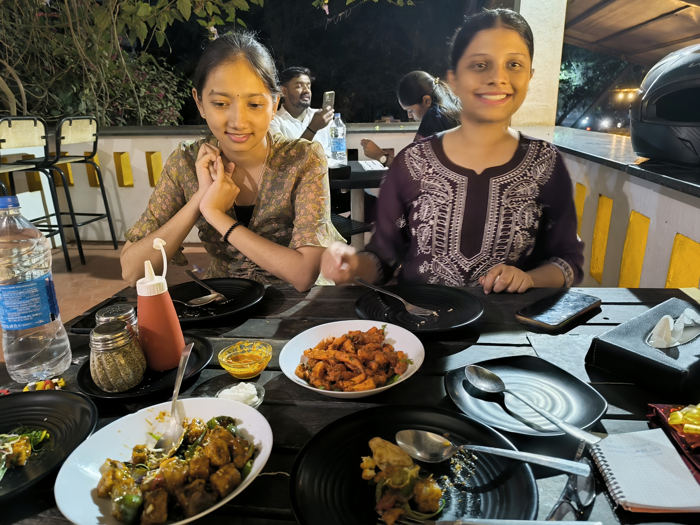 Wir haben die Beiden am Sonntag Abend kennengelernt, nachdem die Beleuchtung des Palastes zu Ende gegangen war. Sie zeigten uns einen kleinen Elephant - Temple, nachdem sie uns zuvor von einem Transvestiten befreit hatten, plauderten mit uns, fanden Angelikas Augen so beautiful, gaben uns ihre Telefonnummer mit der Einladung, uns zu melden und so sitzen wir jetzt in einem kleinen Lokal zusammen und verspeisen indische Köstlichkeiten.