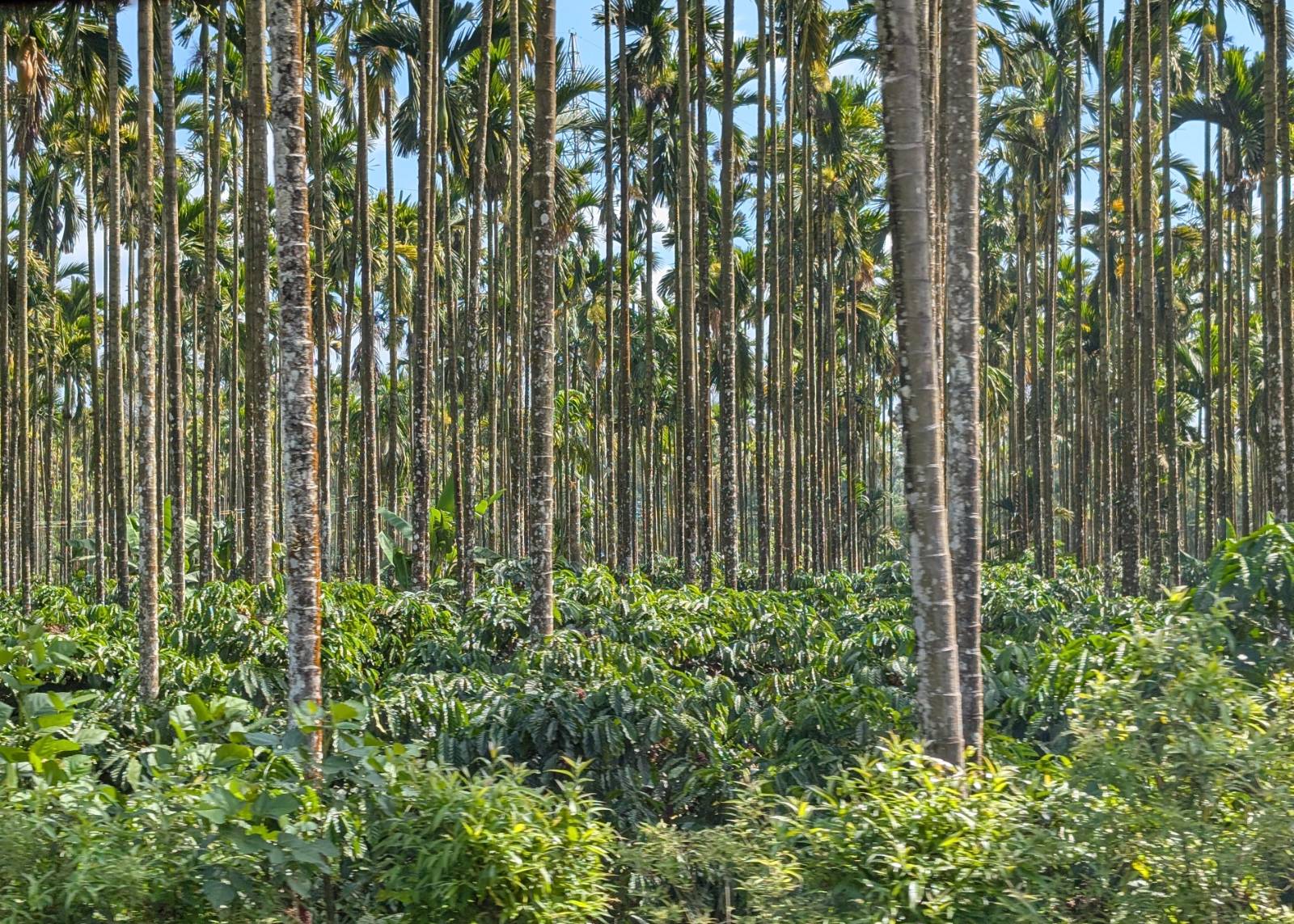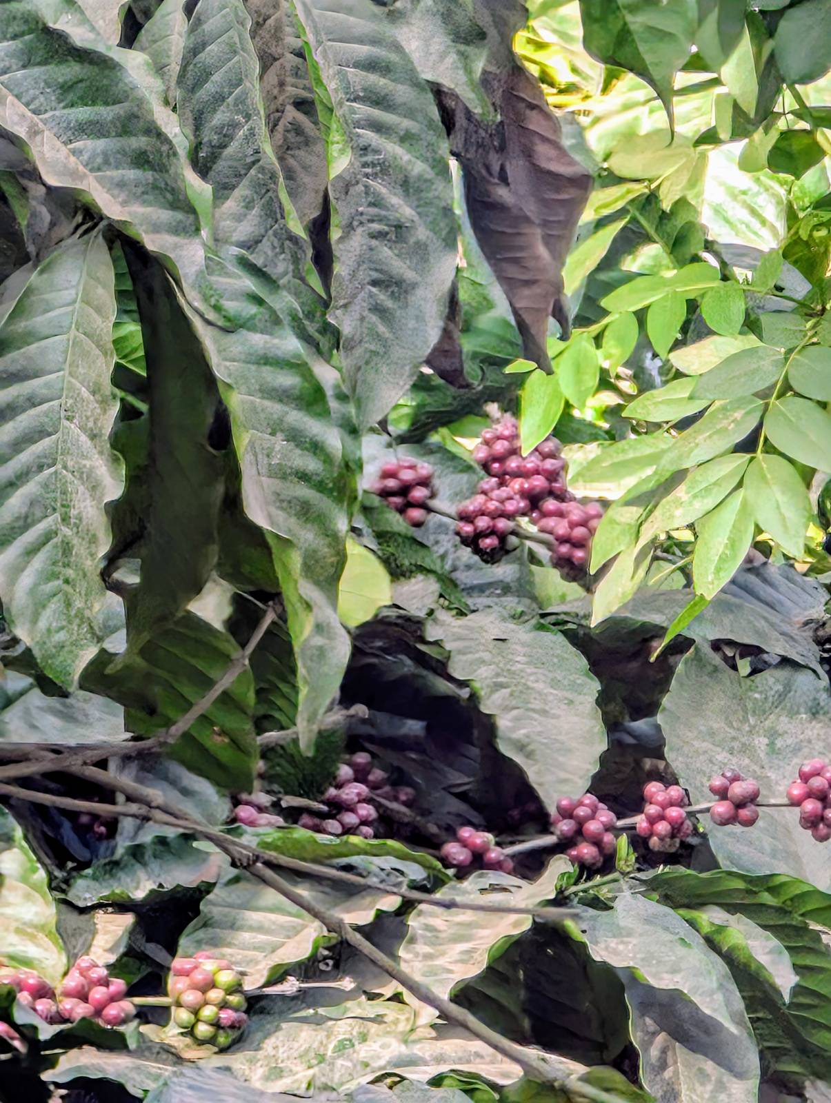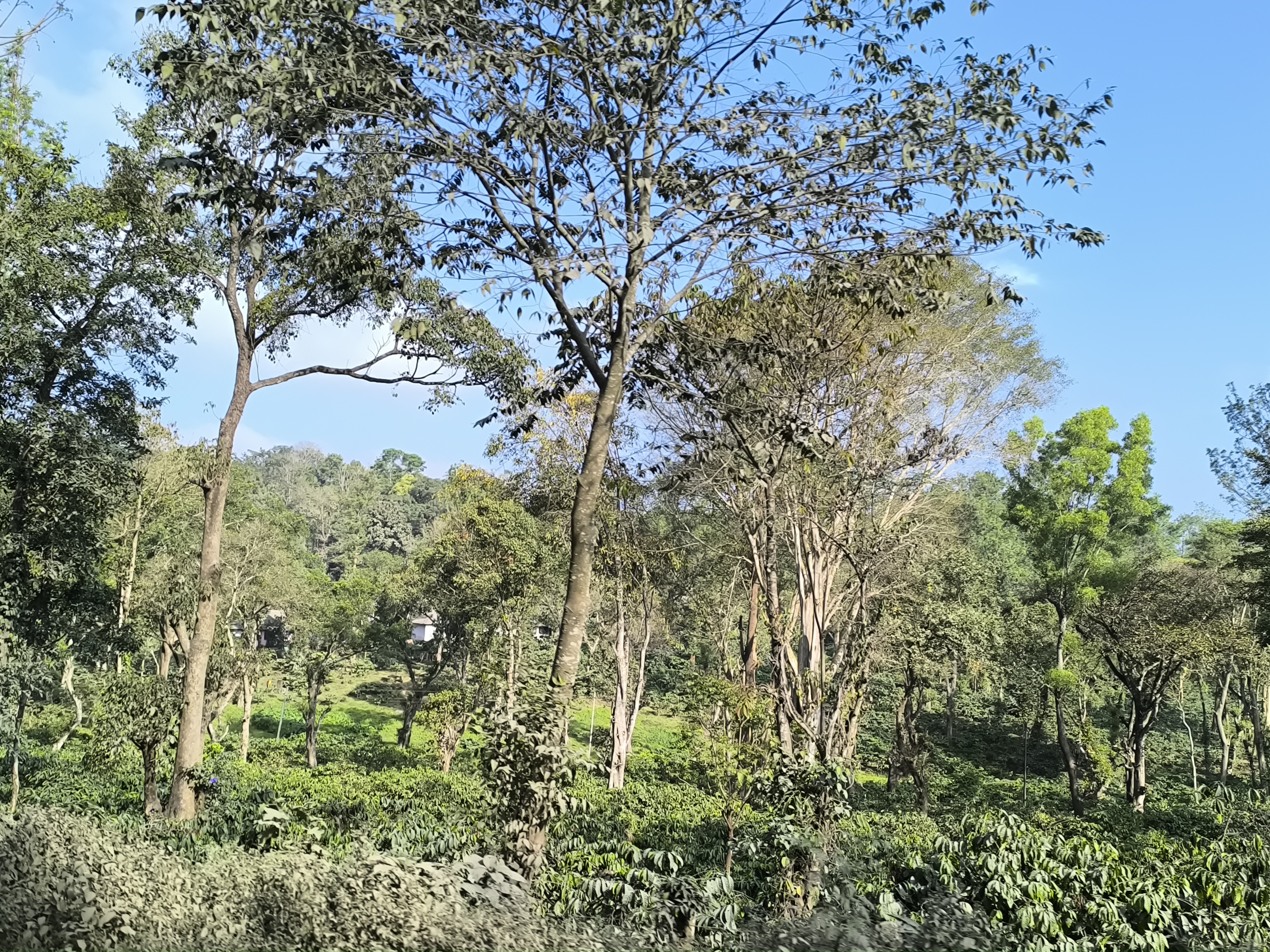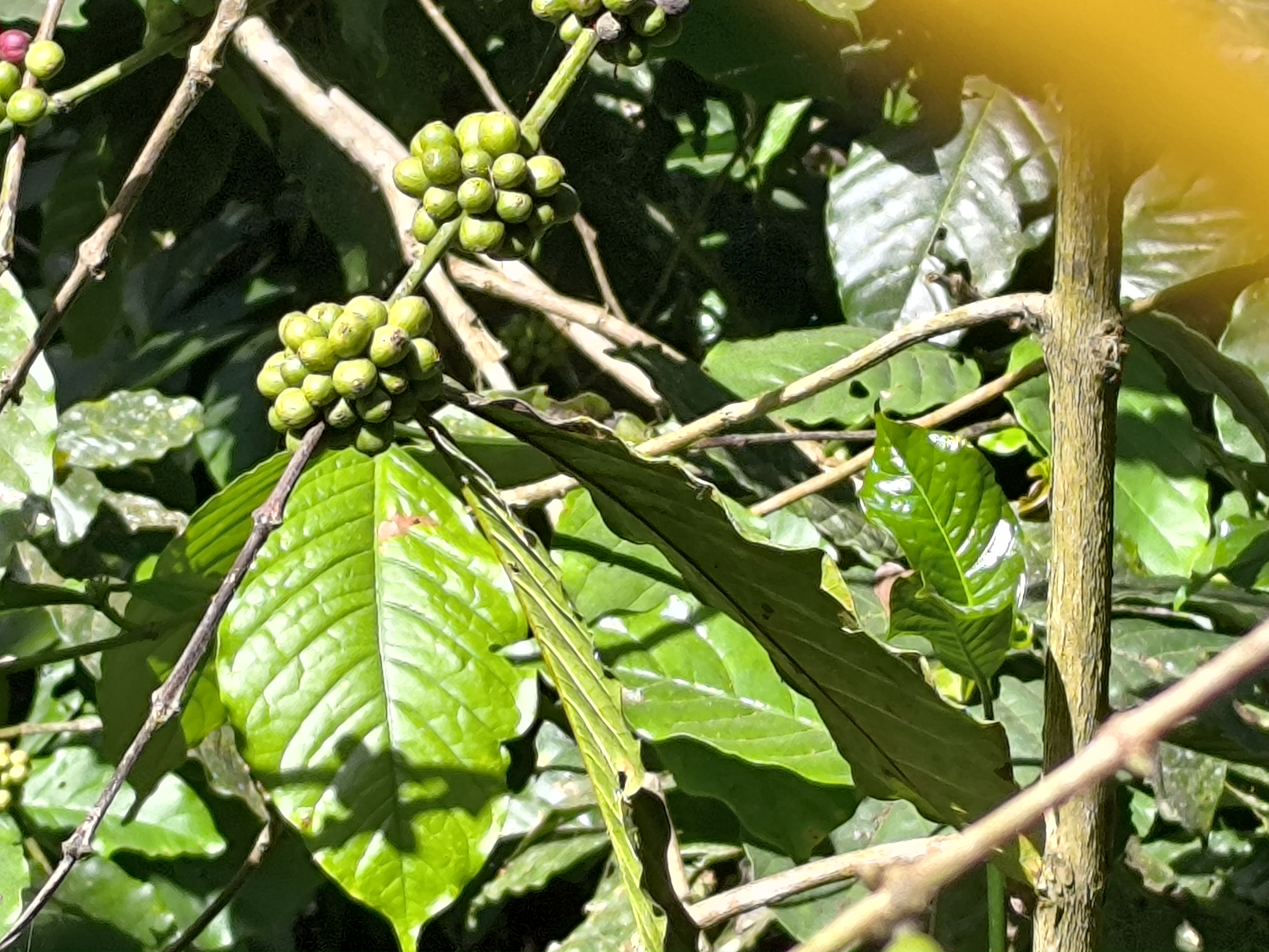 Auf einer landschaftlich sehr schönen Strecke mit vielen Hügeln und vorwiegend lichtem Laubwald fuhren wir mehr als 60 km ununterbrochen an Kaffeeplantagen vorbei. Es war unglaublich beeindruckend. In den flachen Tälern dazwischen war Reisanbau üblich. Die Ernte war gerade vorüber und die Bauern zum Teil bereits wieder mit der Bepflanzung beschäftigt. Natürlich finden sich in den Kaffeeplantagen auch Bananenstauden und diverse Palmen, vor allem eine sehr schlanke , hochwachsende Art.