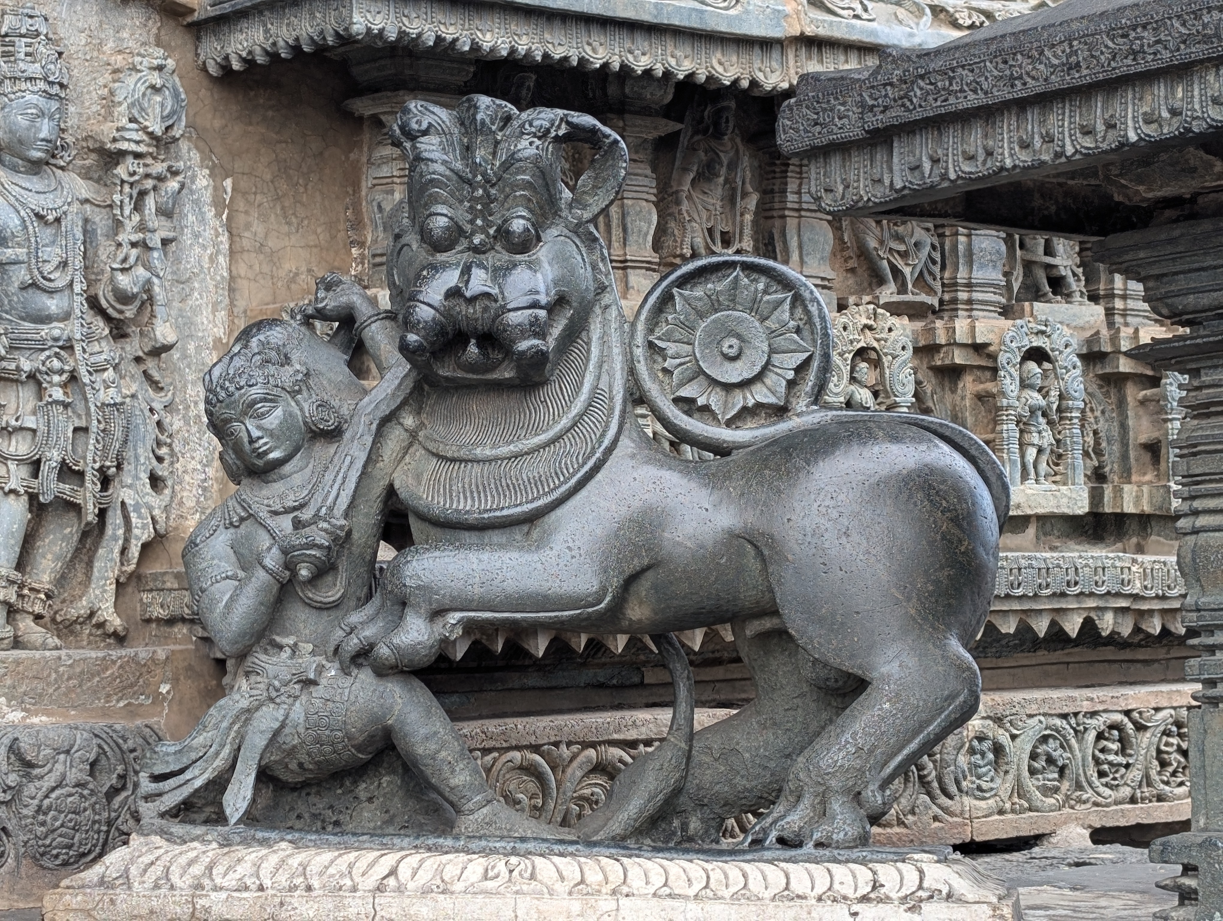 Der erste Hoysala im Kampf mit einem Ungeheuer. Diese Darstellung findet sich bei allen Hoysala Gebäuden.