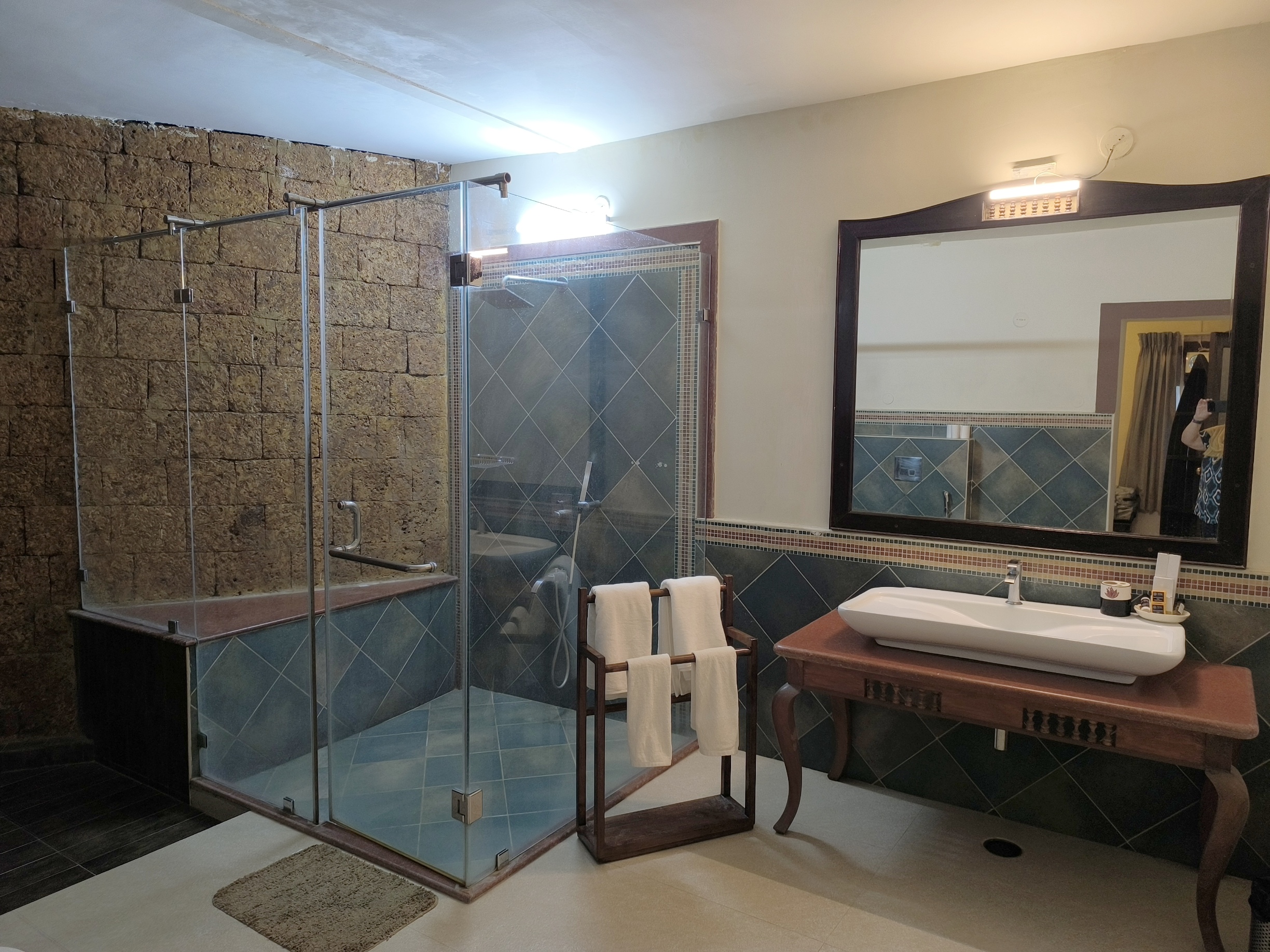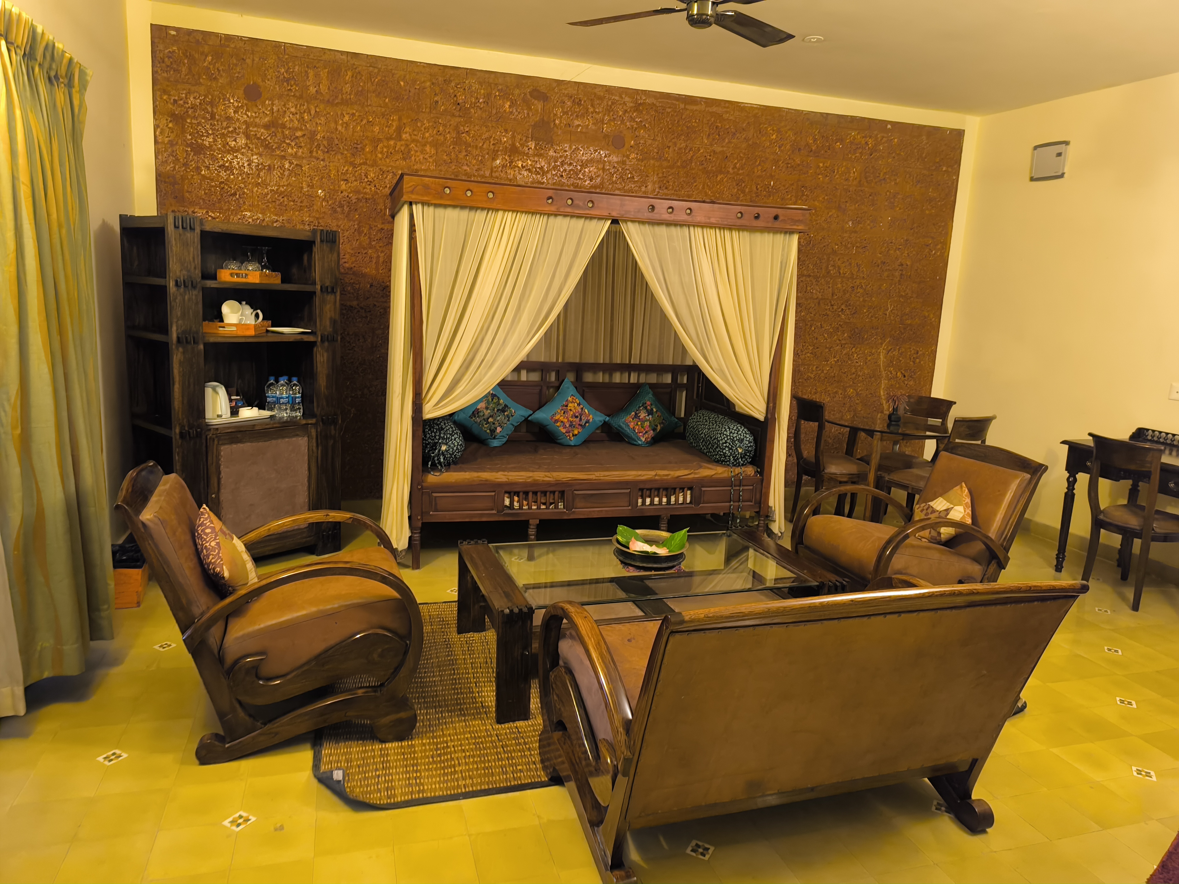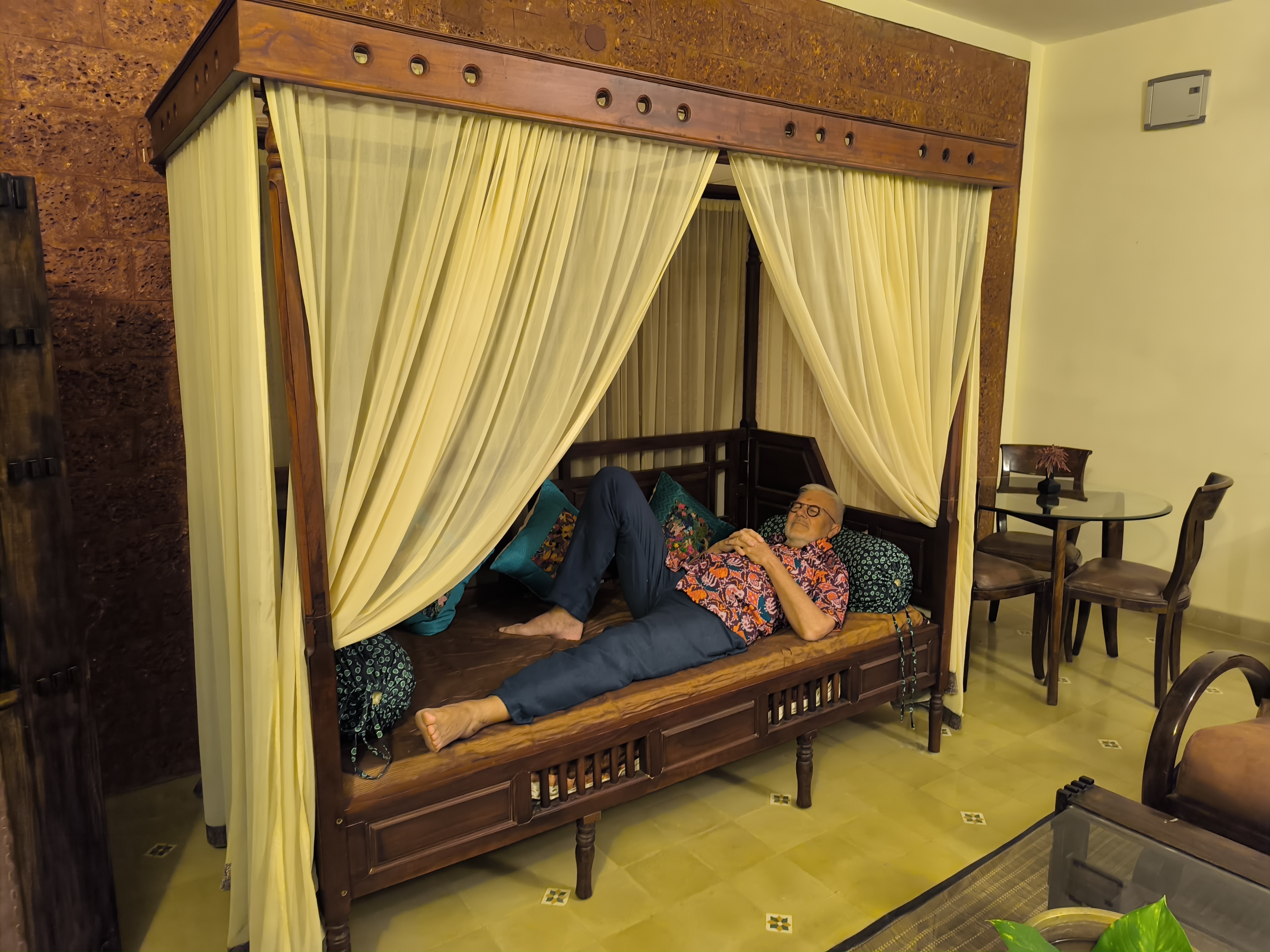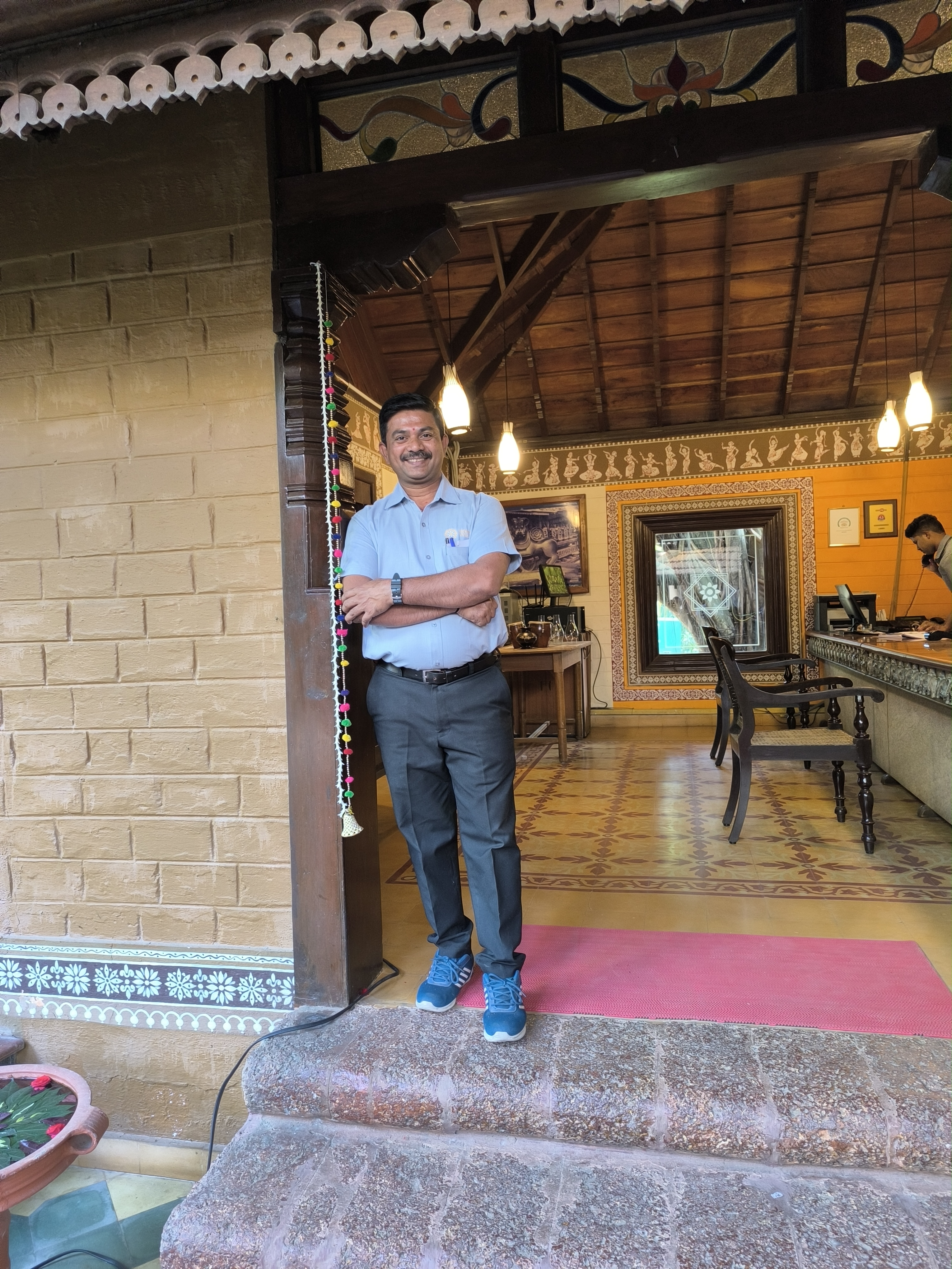 Ein wie auch immer verkleideter, über das ganze Gesicht strahlende Inder öffnet die Autotür und bittet uns, in die Rezeption weiterzugehen. Auf dem Weg bekommen unsere Hände einen Guss Wasser zur Reinigung und Erfrischung, dann wir uns ein roter Punkt über die Nasenwurzel gedrückt und nachdem wir die Pässe abgegeben haben, bekommen wir ein köstliches Willkommensgetränk.