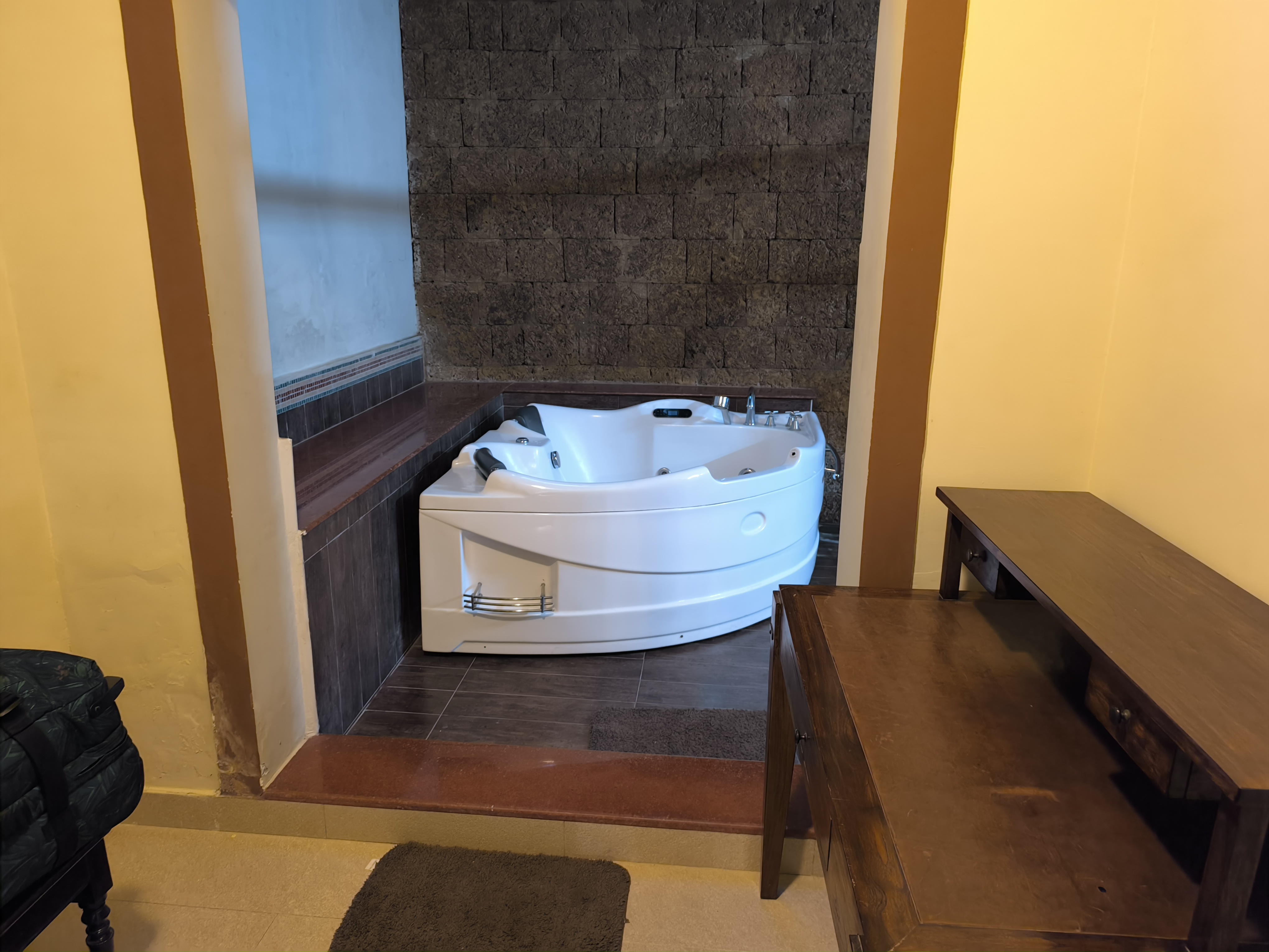 Nach den notwendigen Formalitäten begleitet man uns in unsere Räumlichkeiten. Zuerst ein Wohnraum mit 20 m² mit 16 m² beschatteter Terrasse, gefolgt von 30 m² Schlafraum mit Luxusbett, Stühlen, Ablagen und Kasten, weiters ein durch Zwischenwand getrennter Raum mit nochmals 20 m² mit großzügiger Dusche und Waschbecken, Whirlpool und Ablagegelegenheit für Koffer und Diverses.