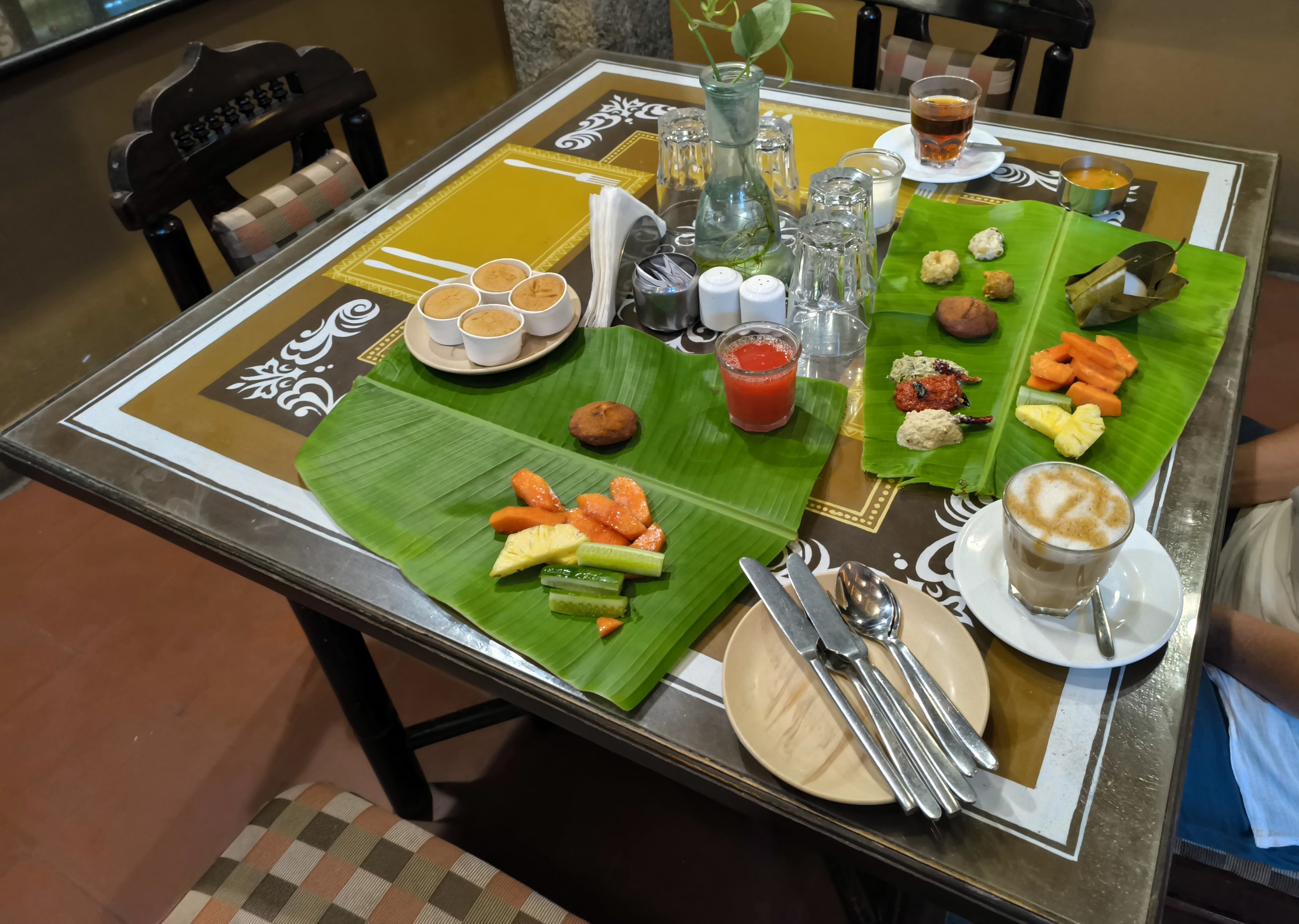 So startet das indische Frühstück. Dann kommen noch dazu: Omlett, Idli, Toast, div. Naan und es wird noch Einiges gebracht, das wir unbedingt kosten müssen. Das Personal freut sich immer, wenn wir zum Frühstück kommen - Yes, we like SPICY and we want to try everything ....