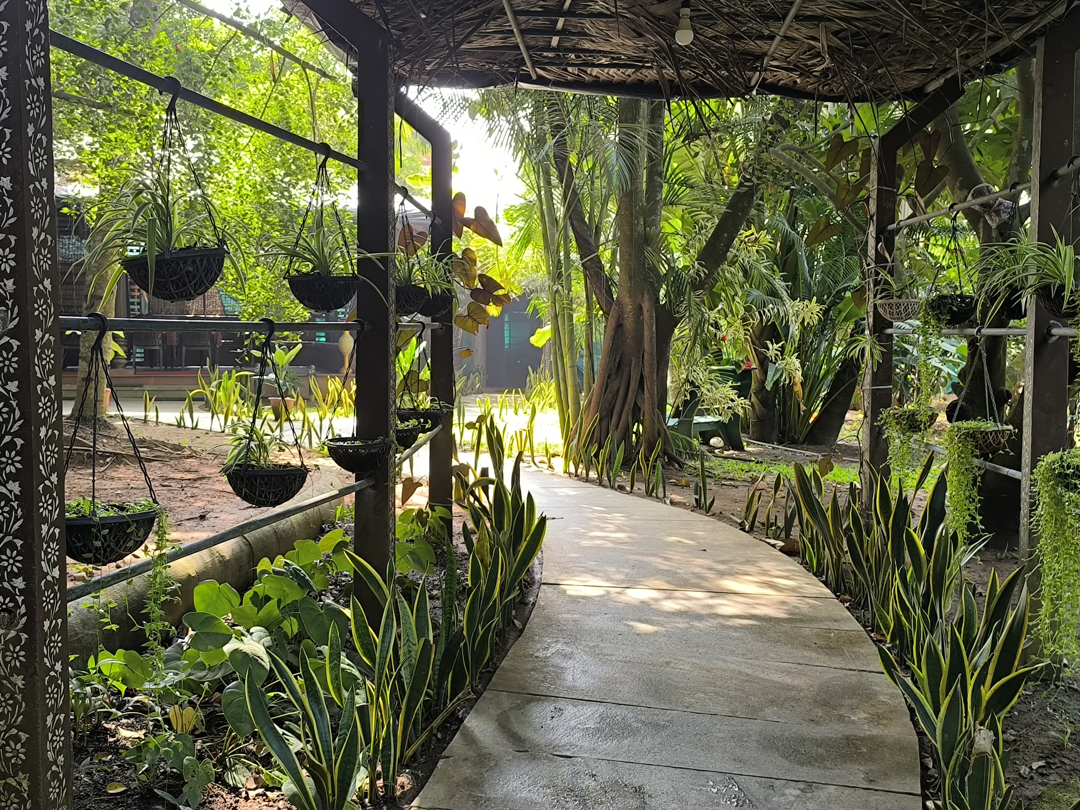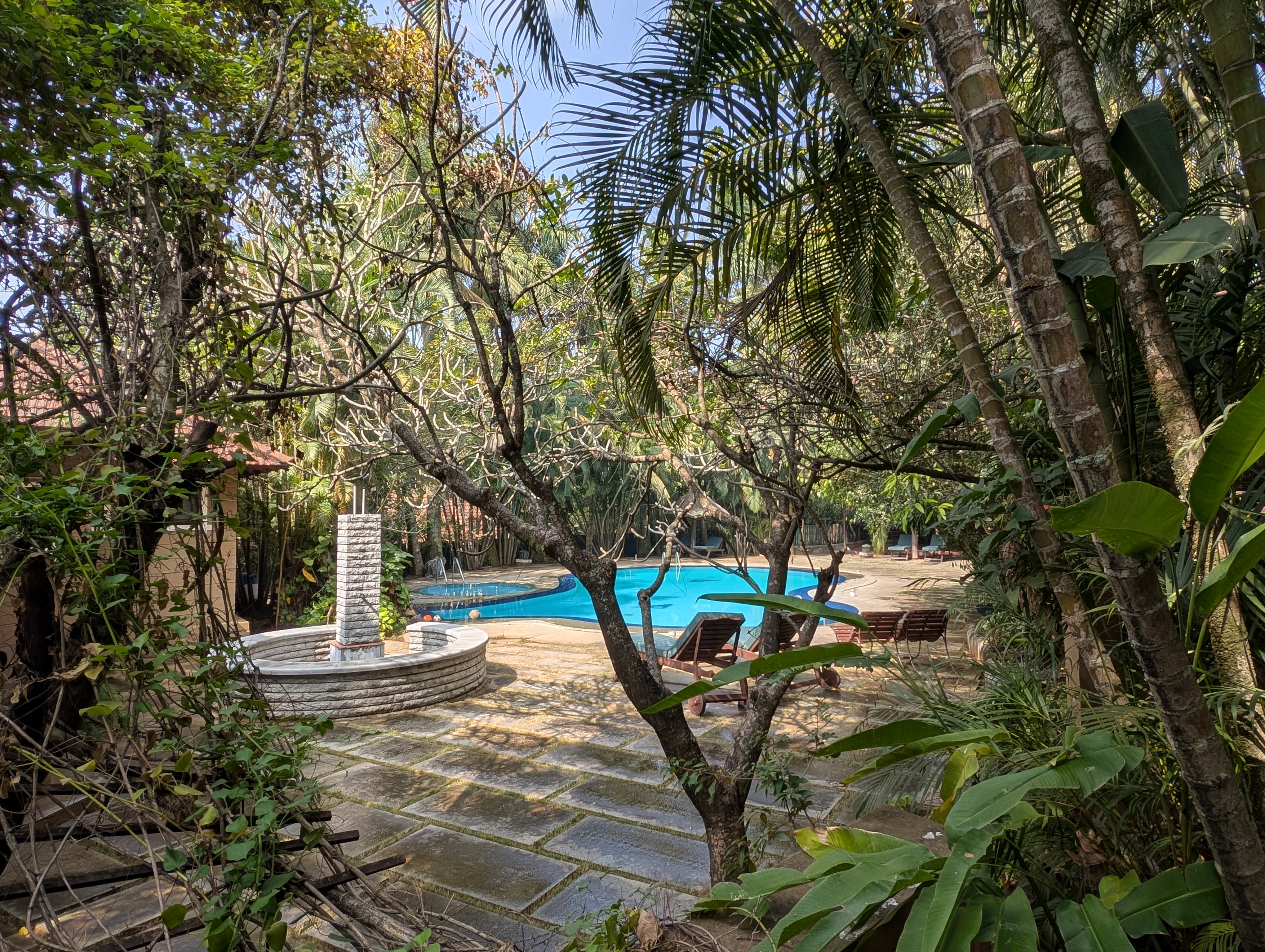 Das Resort liegt in einer mit vielen verschiedenen Bäumen und Sträuchern bepflanzten Anlage, überall blüht etwas, die Bungalows und das Hauptgebäude verschwinden nahezu im Grün der Pflanzen. Es riecht nach Räucherwerk, Küche und Zitronenöl. Ein hübscher Pool und Massagebehandlung sind vorhanden und das Essen ist köstlich.