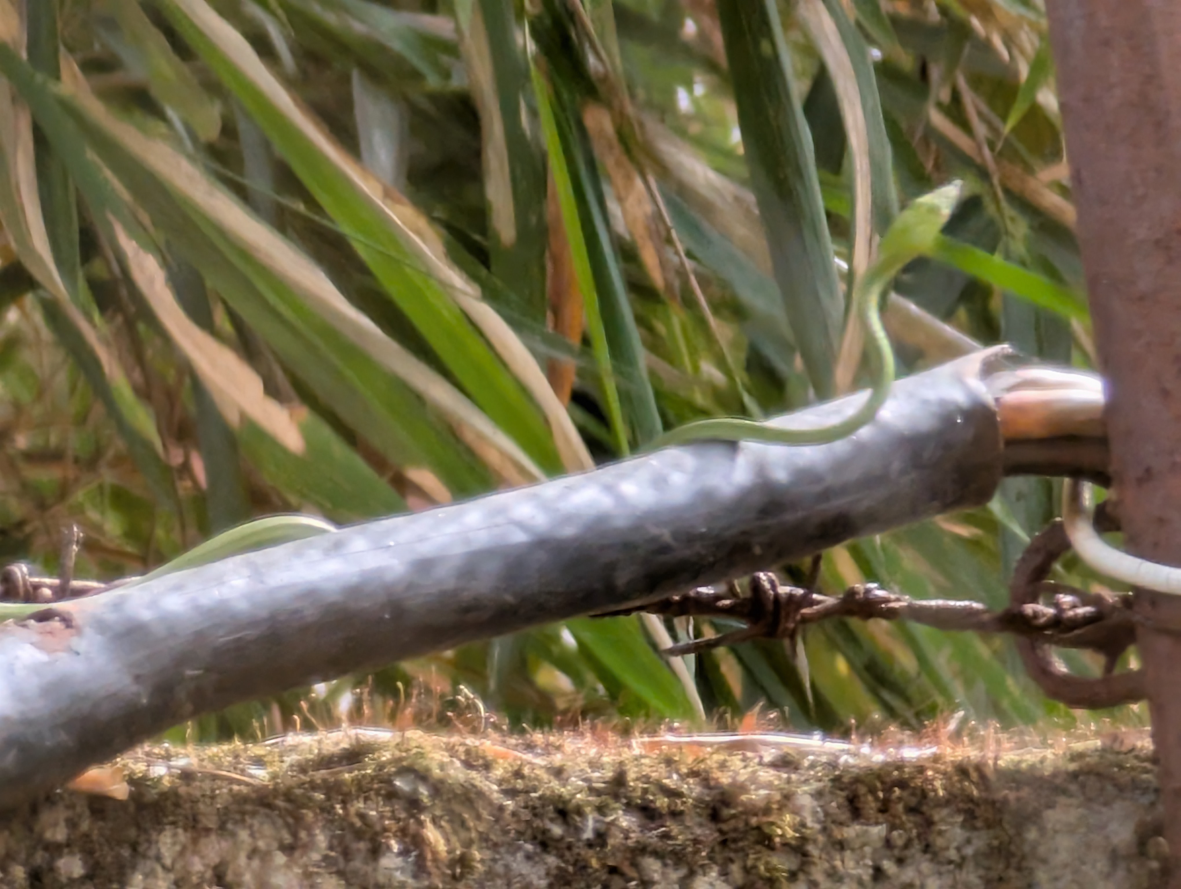 Diese grüne Schlange kann bis zu 1,90 m lang werden, heißt Baumschnüffler und ernährt sich von Wirbeltieren (Vögel, Eidechsen, Frösche..) Wir haben sie vor unserem Fenster gesehen.