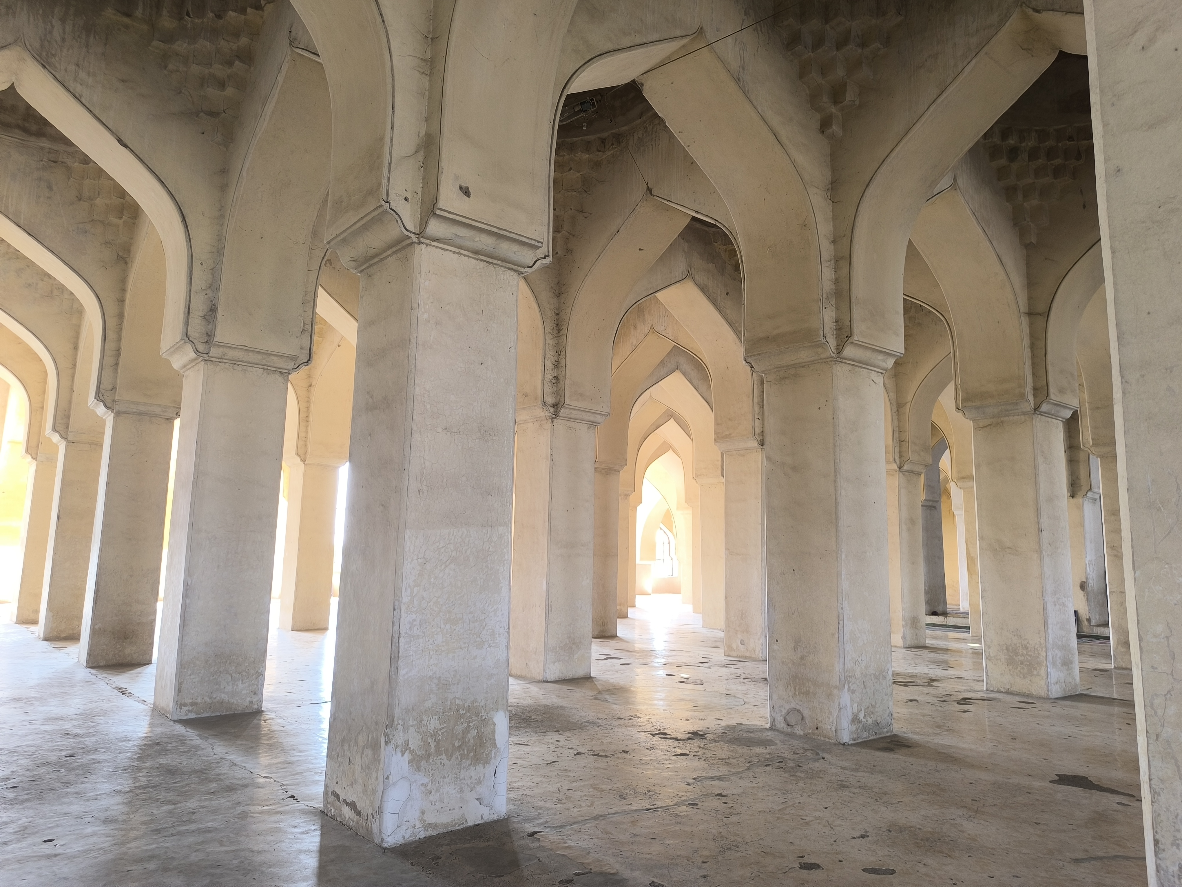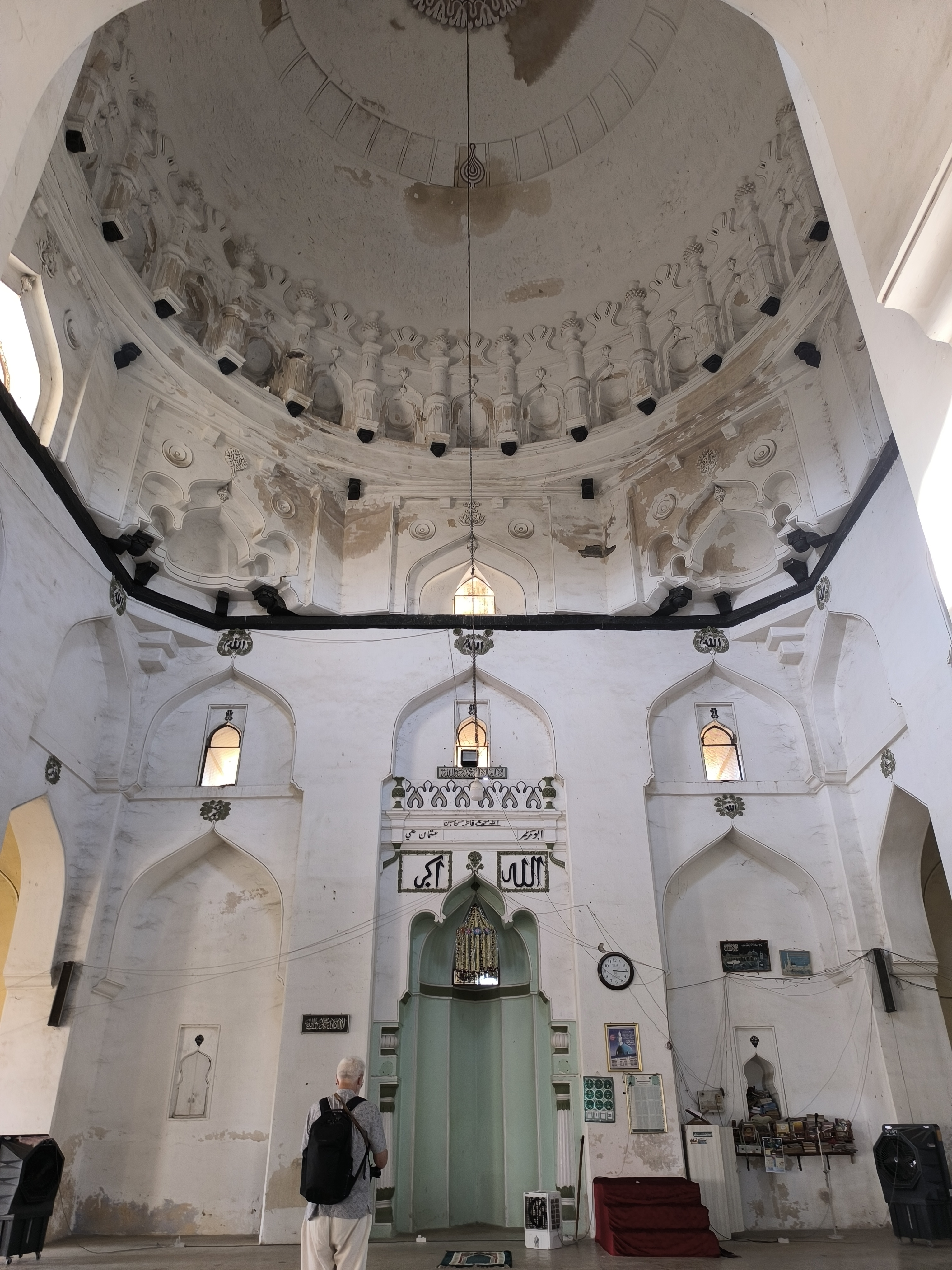 Der zentrale Bereich der quadratischen Moschee ist durch Säulen in Gänge getrennt die von 68 Kuppeln überwölbt sind. Die Kibla - die Nische vor der der Muezzin vorbetet - liegt im Westen und wird von einer großen Kuppel, die vier Eckpunkte des Quadrats von vier mittelgroßen Kuppeln geziert. Da die Jama Masjid die Freitagsmoschee ist, kamen wir gerade zum Nachmittagsgebet an und durften sie nicht betreten.