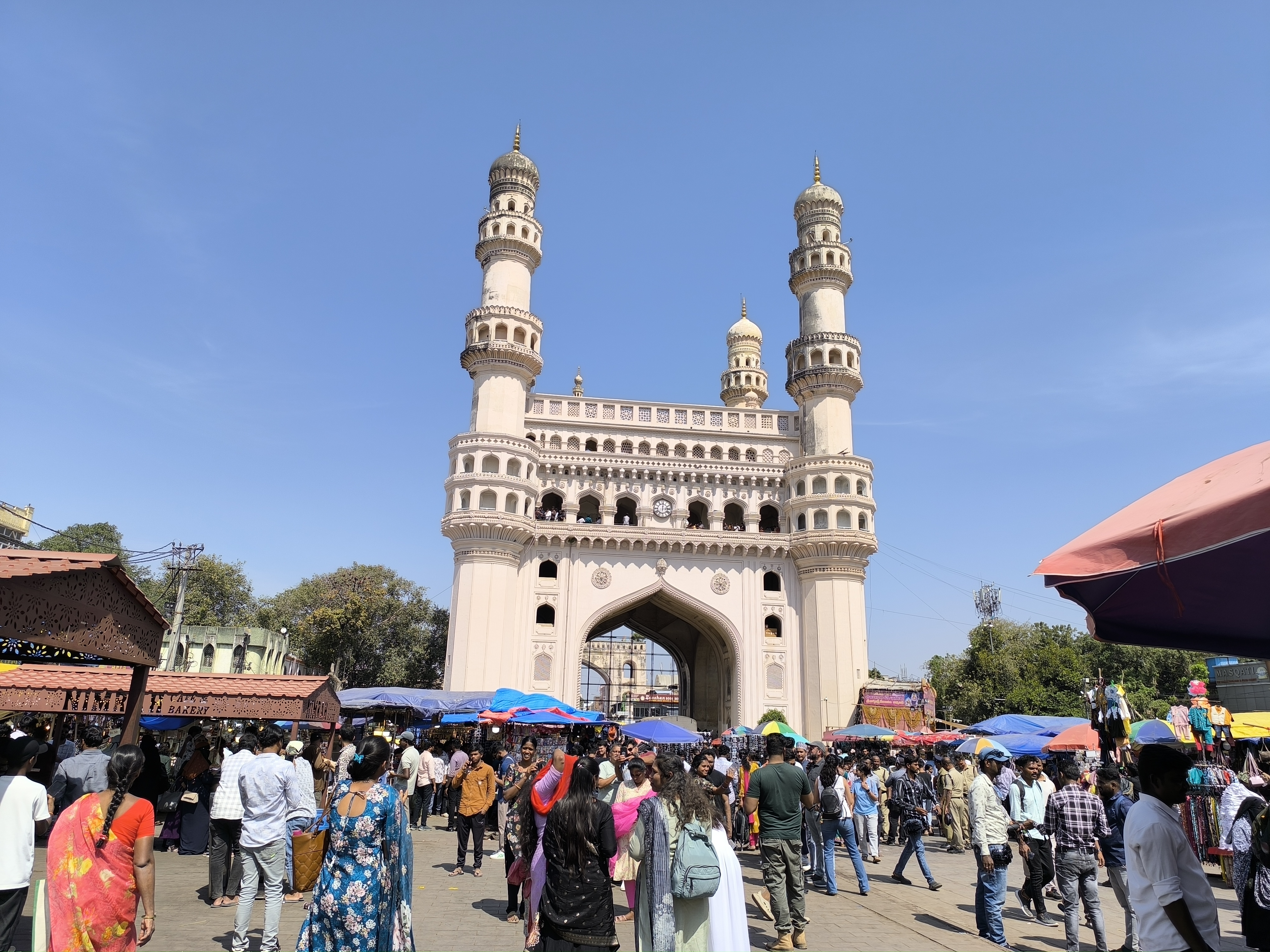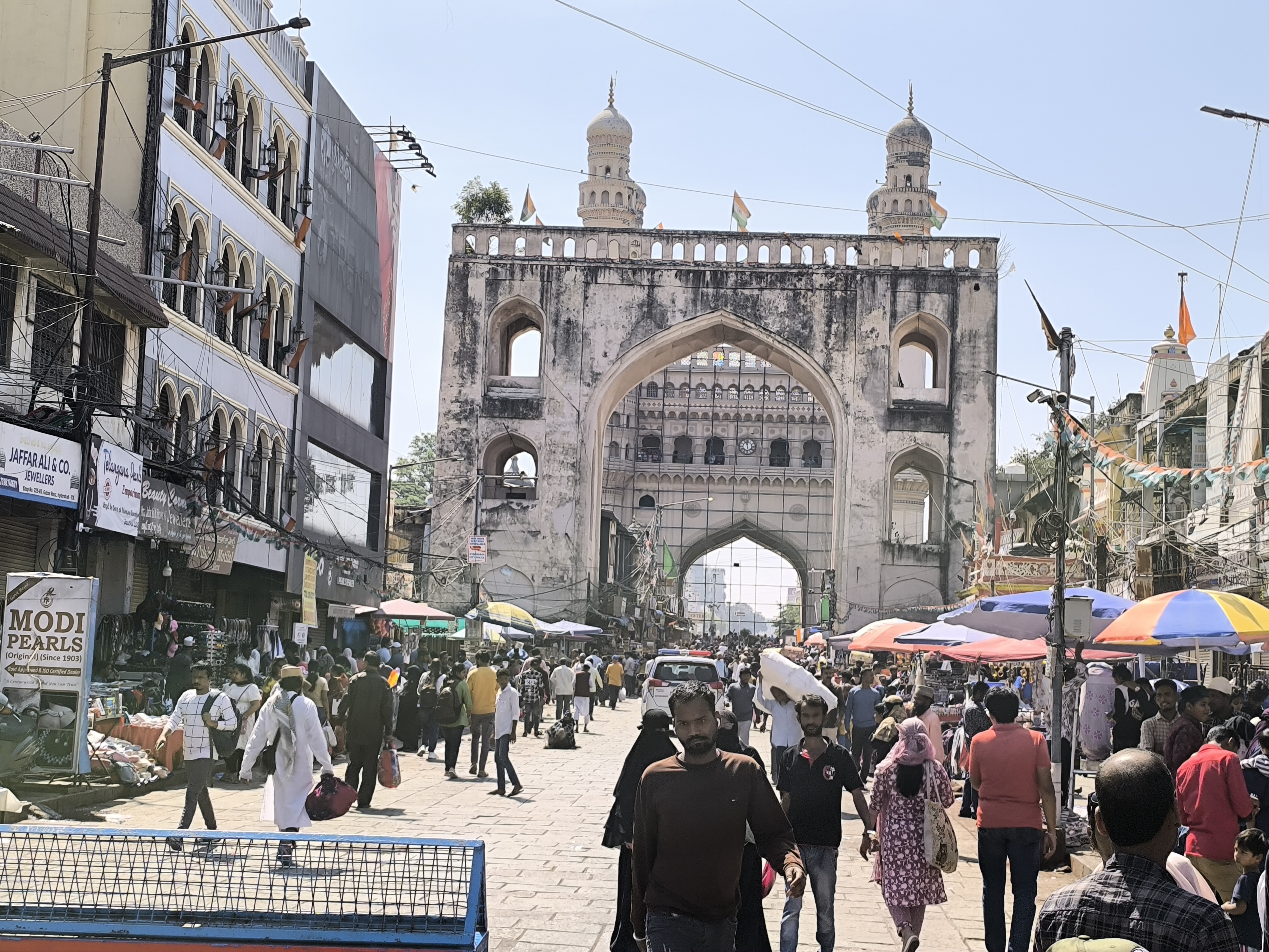 Tags darauf gings mit dem Tuktuk in die Altstadt zum Char Minar, ein fast 60 m hohes Bauwerk, sowohl Stadttor und Moschee zugleich. Sehr schön und beeindruckend. Auf die Galerie gingen wir nicht, da zu viele Leute anstanden und auch die Temperatur entsprechend hoch war. Aus der benachbarten Moschee mit einem Raum für mehr als 10000 Betende wurde ich hinausgebeten, also stürzten wir uns in das Marktgetümmel der Altstadt.