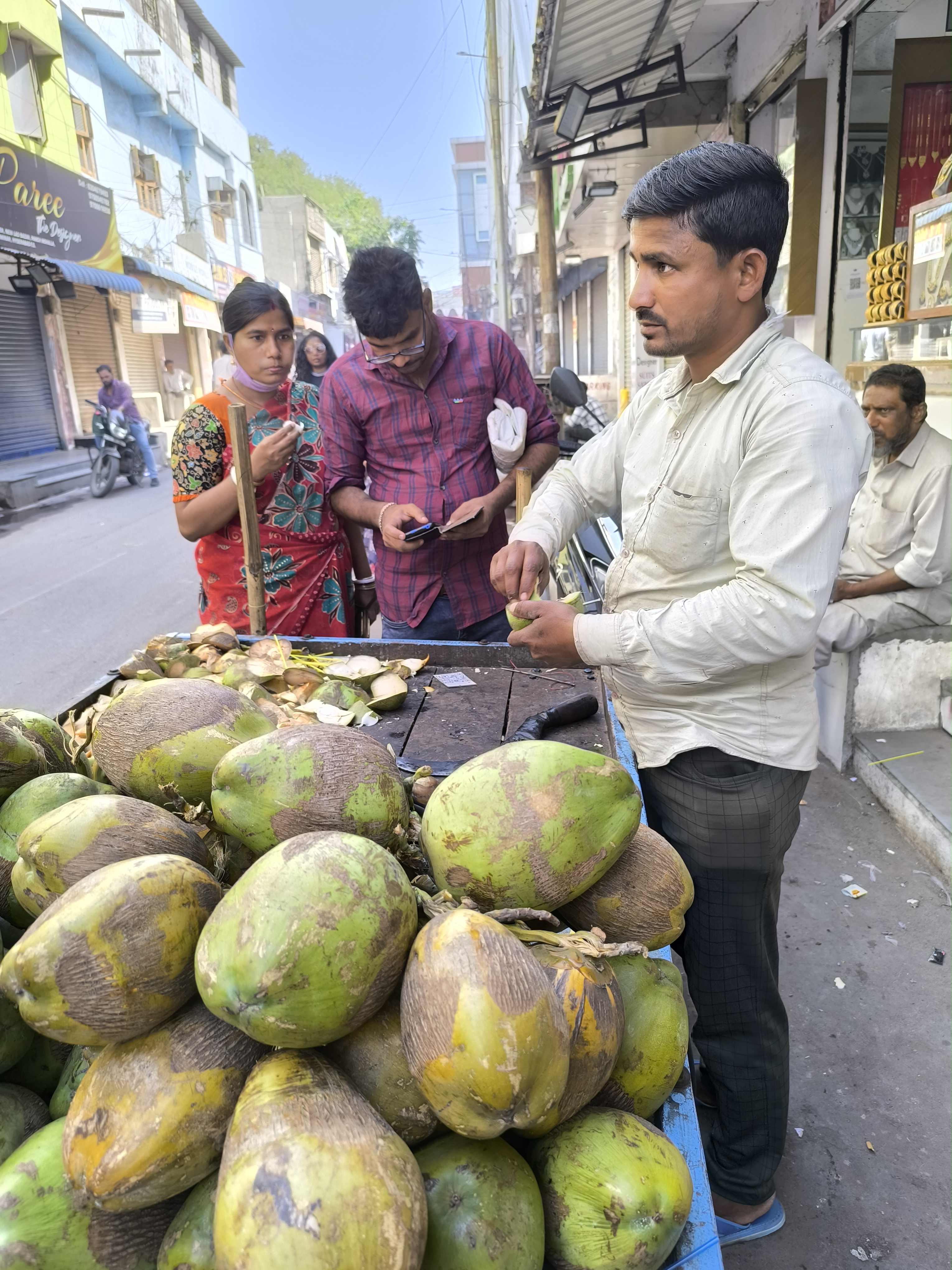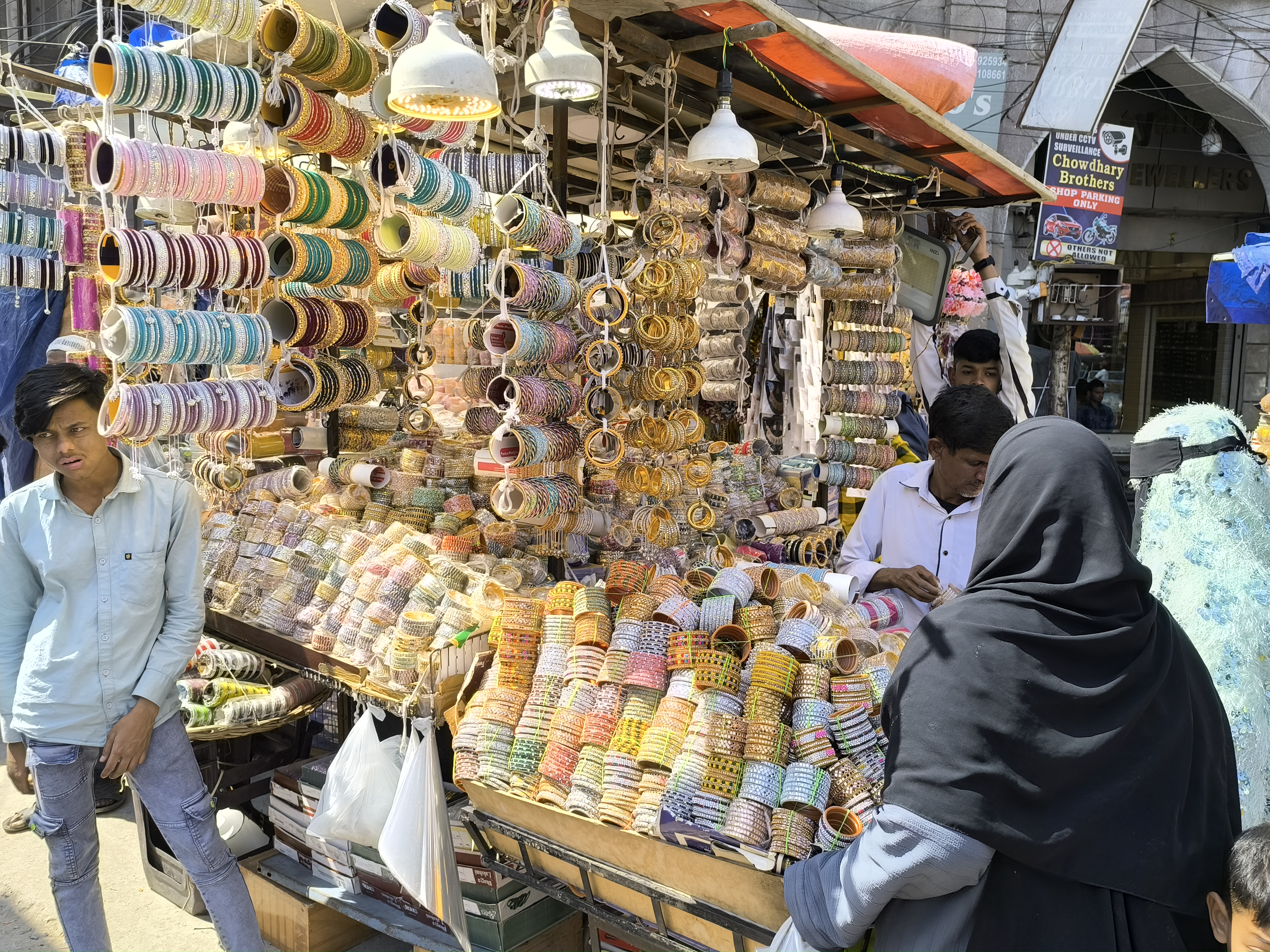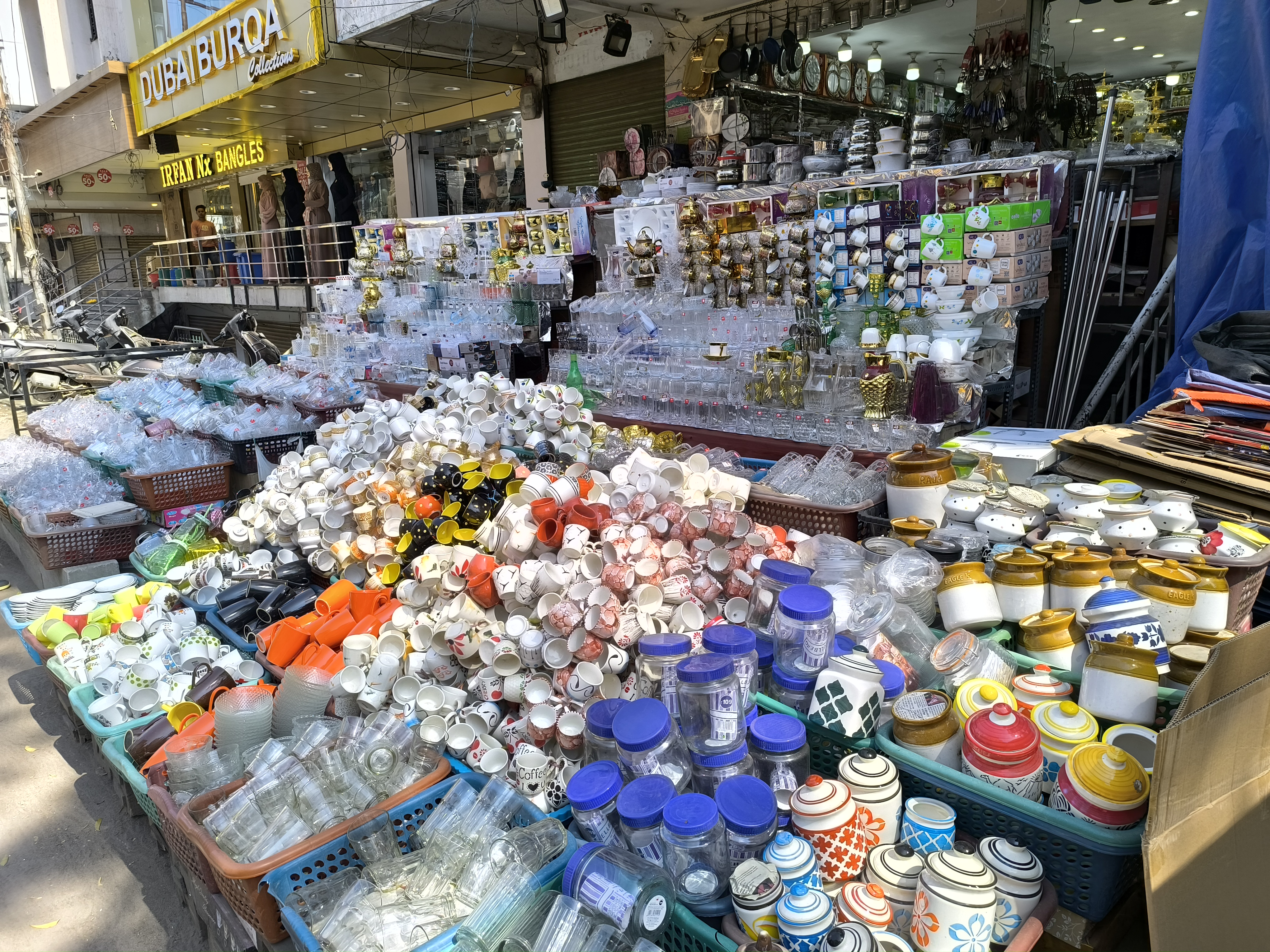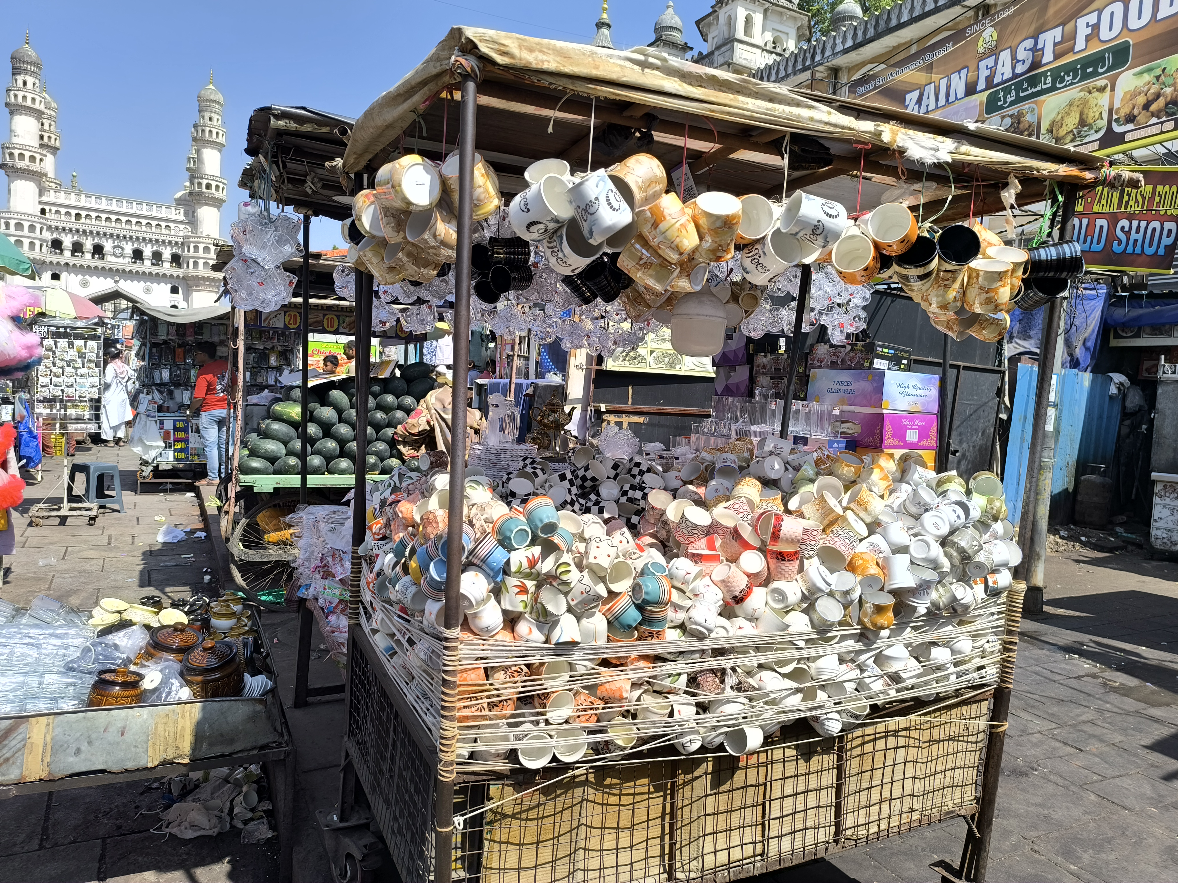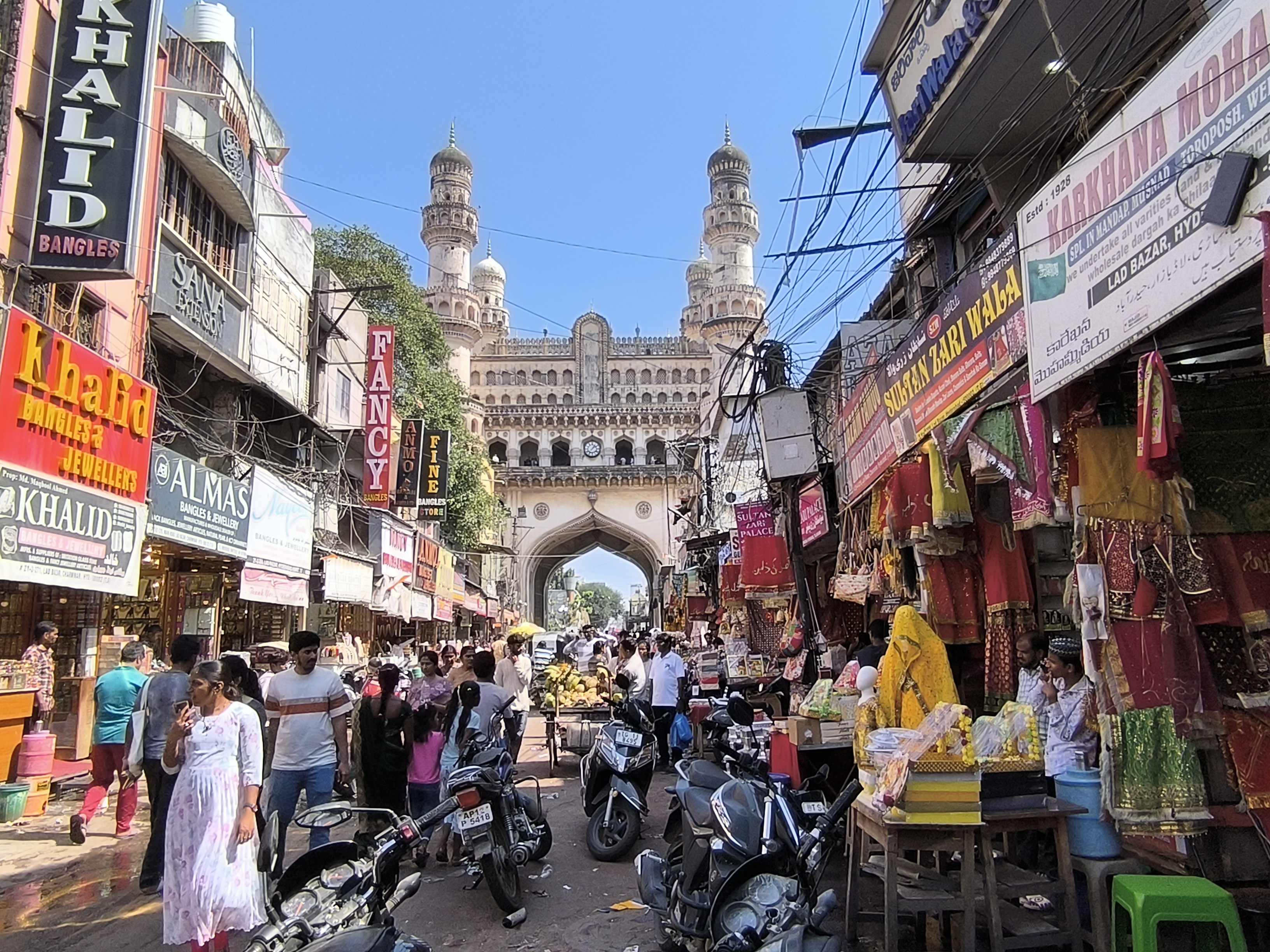 Hyderabad ist unglaublich anstrengend, furchtbar laut, unglaublich viel Verkehr und hier in der Altstadt massenhaft Menschen, die alle etwas verkaufen oder kaufen wollen. Von hoher Qualität bis zu billigem Ramsch wird alles angeboten, kein Gässchen, wo nicht gehandelt wird. Eine Straße queren zu wollen, ist eine wirkliche Herausforderung, teilweise haben wir wegen der Verkehrsdichte aufgegeben und dann mit einem Tuktuk die andere Seite erreicht.