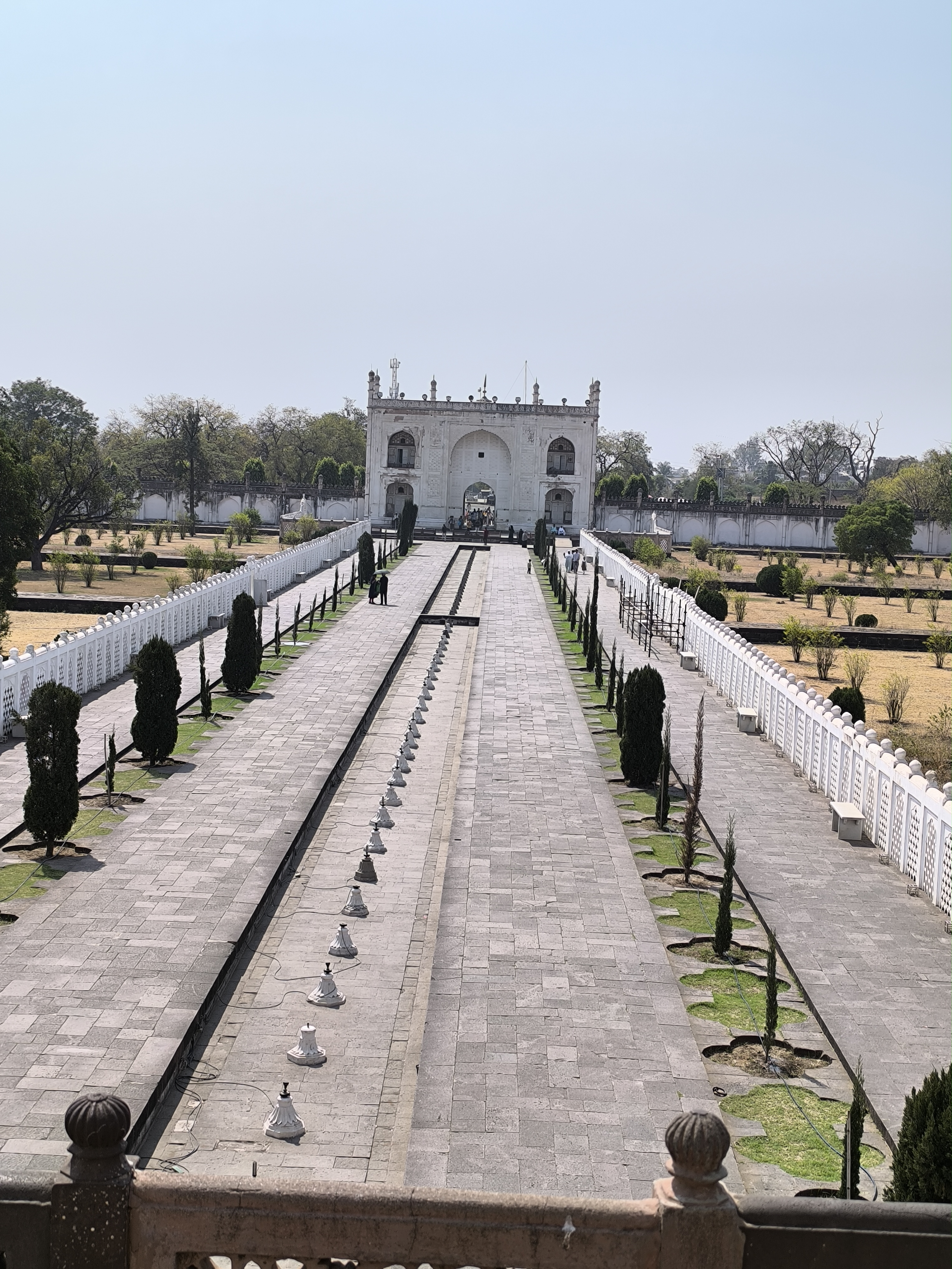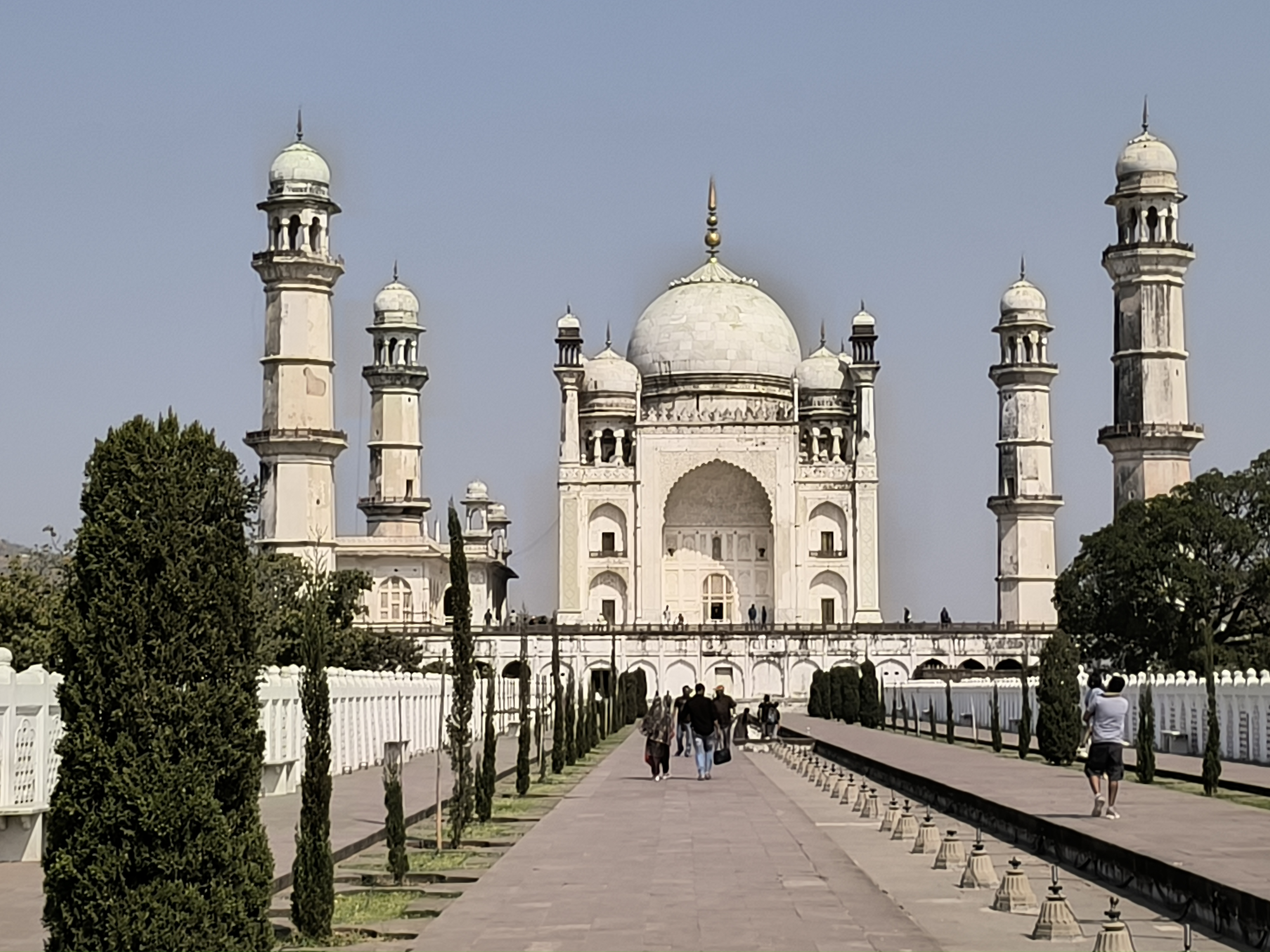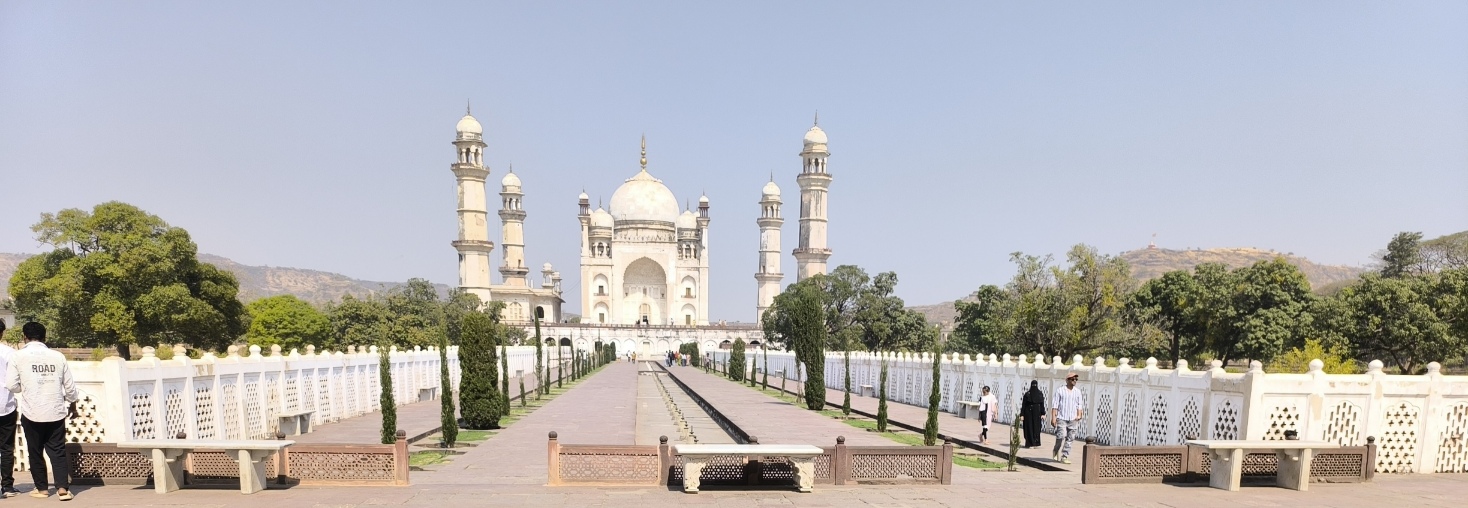 Auf unserer Weiterfahrt zur Bibi - Ka - Maqbara, dem Mausoleum, das Sultan Aurangzeb seiner Frau errichten ließ, stellten wir wieder einmal fest, dass keine der bisher besuchten indischen Städte miteinander vergleichbar sind. Alle sind charakteristisch anders. Auch wenn das Grabmal automatisch an das Taj Mahal erinnert, ist es doch völlig eigenständig in seiner perfekten Symmetrie. Im Zentrum eines von einer Mauer umgebenen Geviertes steht auf einer Plattform der prachtvolle Bau mit vier zierlichen Minaretten und sparsam aber wunderschön und zart ausgeführeten Ornamenten. Zu allen vier Seiten gibt es Becken mit Springbrunnen, welche sich im umgebenden Garten wiederholen und vom Eingang aus führt ein langes, schmales Becken ebenfalls mit Springbrunnen direkt zum Mausoleum. Ein wunderschöner, stiller und friedlicher Ort.
