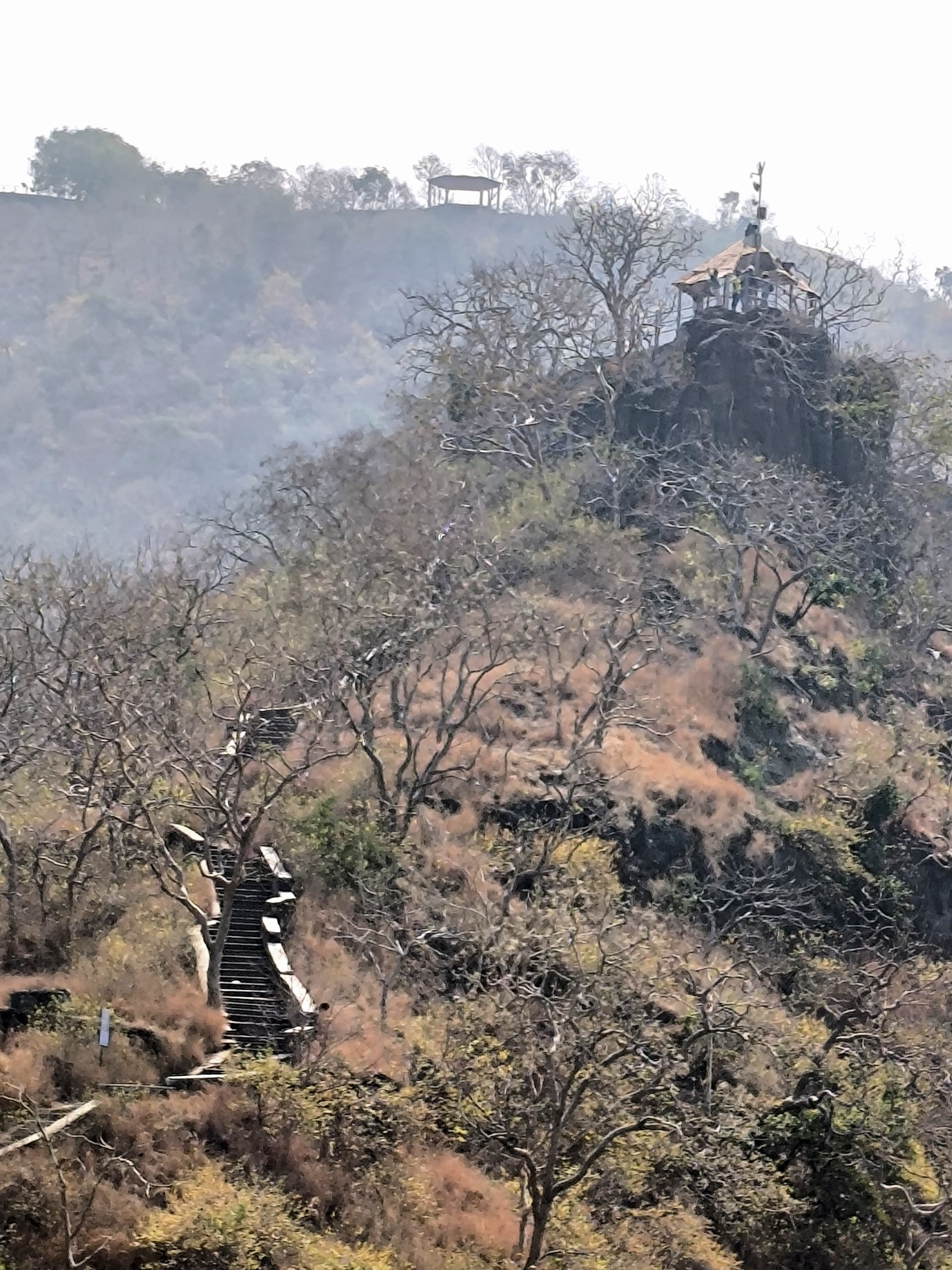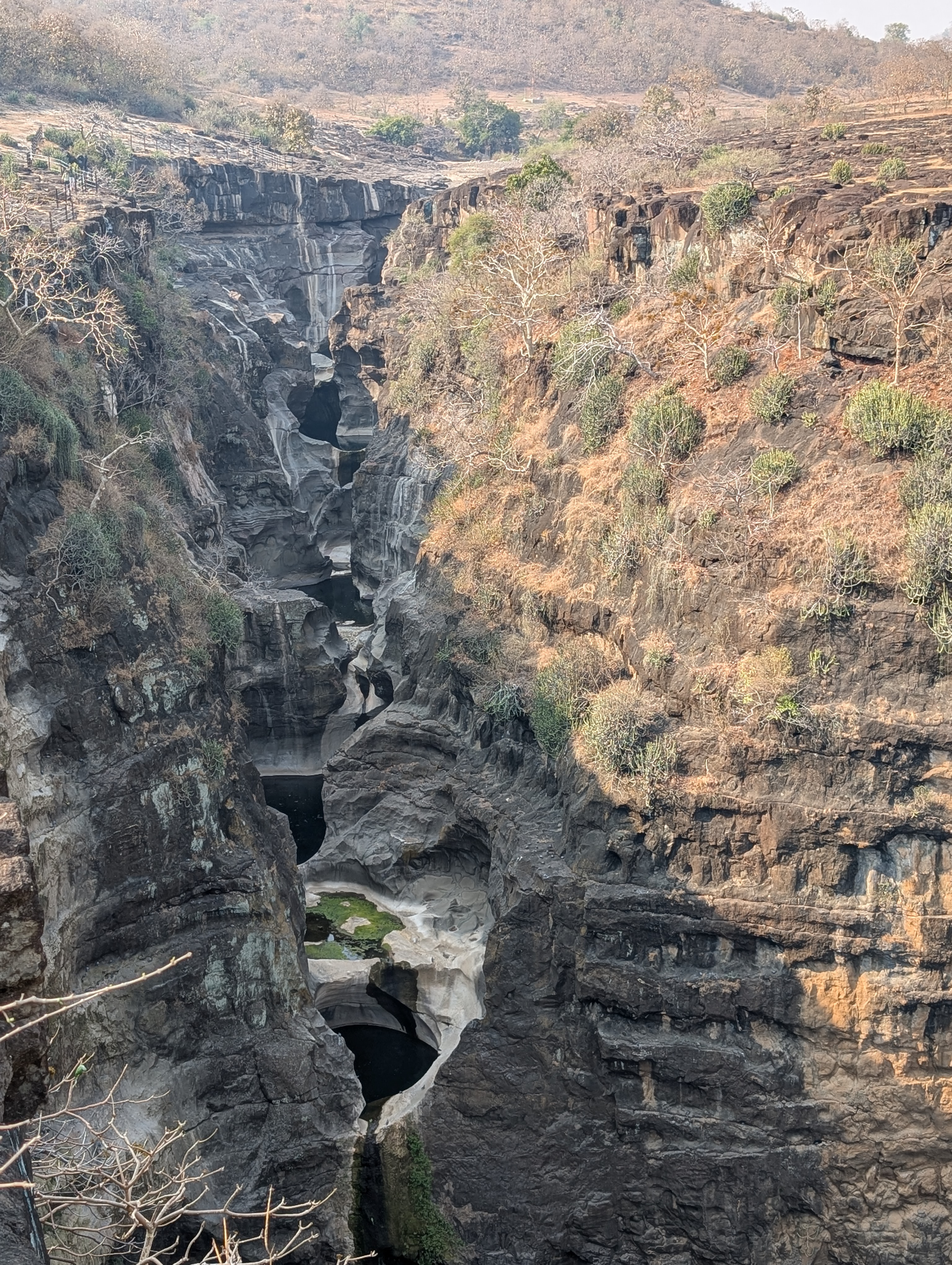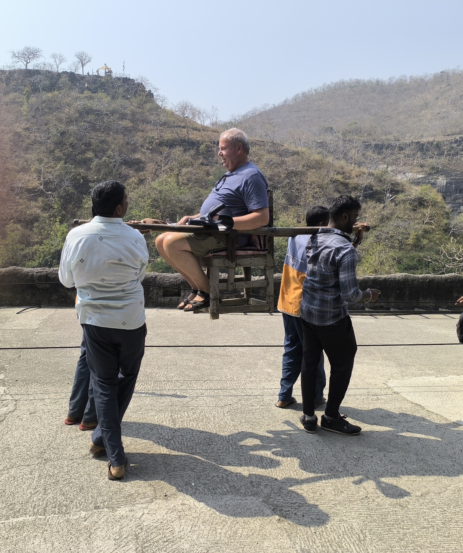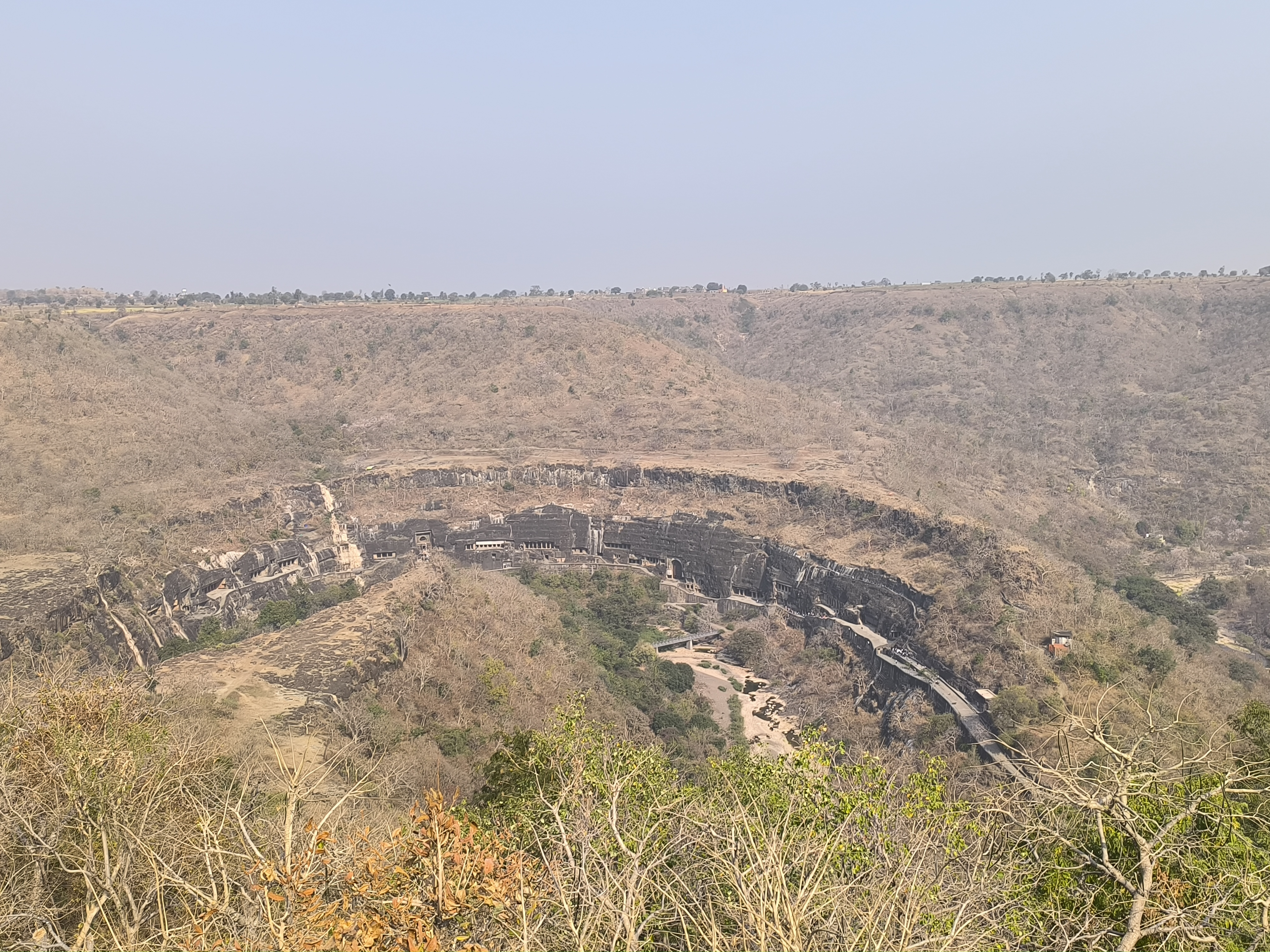 Die Höhlen von Adjanta! Mit 17 Jahren hörte ich erstmals davon während eines Kurses über die Weltreligionen. Heute habe ich, haben wir sie endlich gesehen. Von oben betrachtet breiten sie sich halbkreisförmig vor uns aus. Darunter fließt der Waghora Fluss.