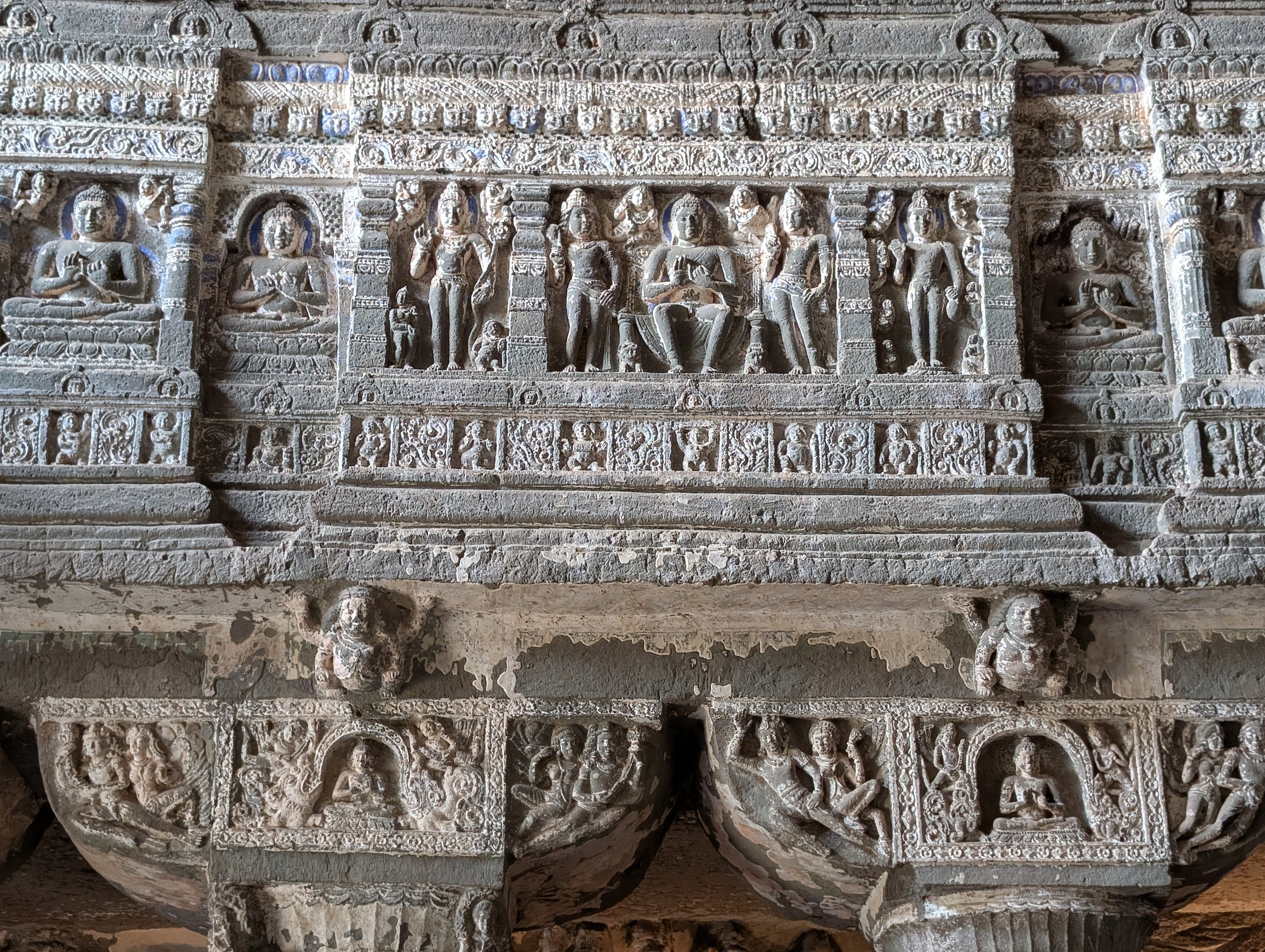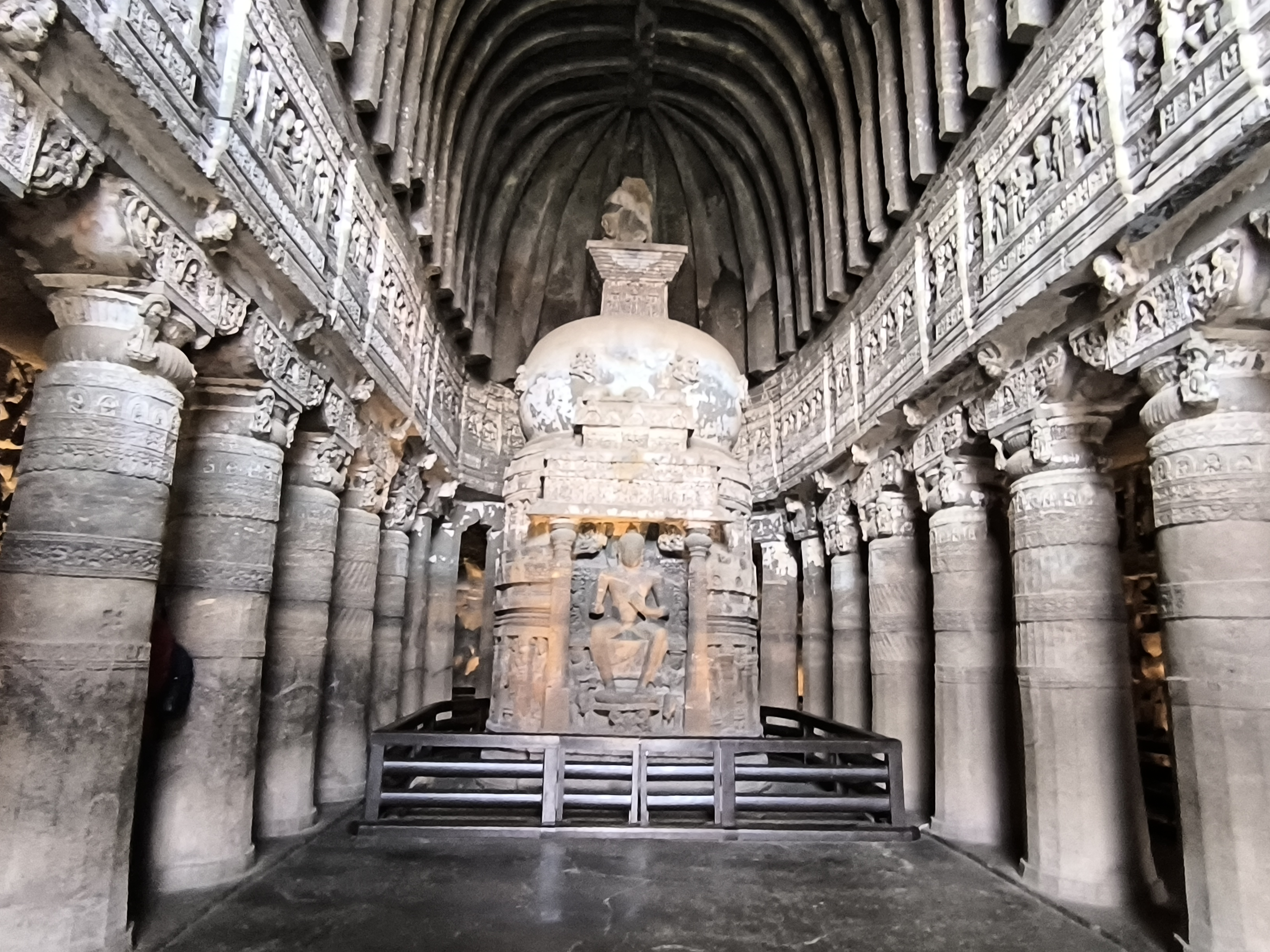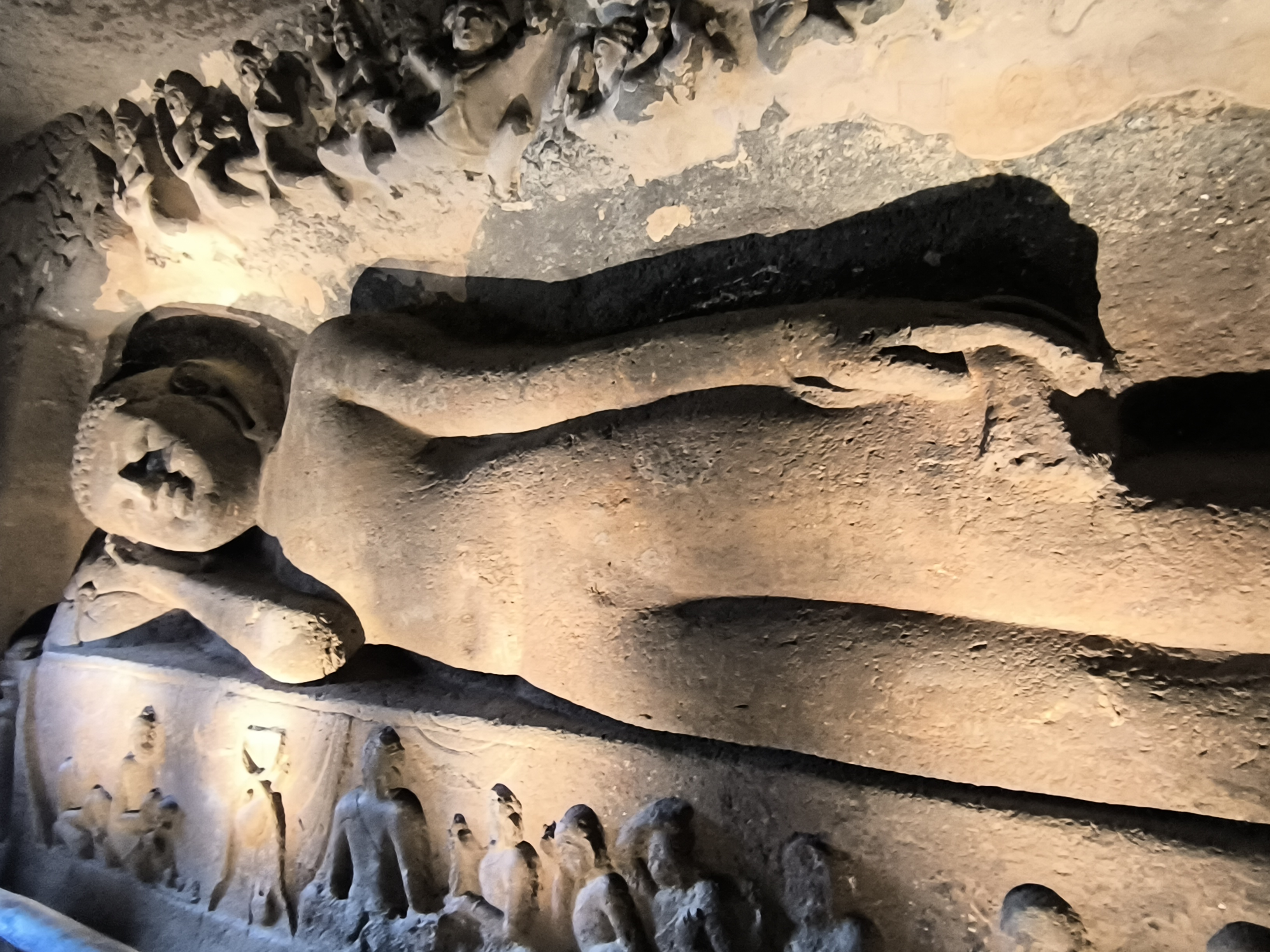 Zwischen dem 2. Jhdt vor und dem 7. Jhdt. nach Christus wurden 29 Höhlentempel aus dem Gestein geschlagen. Alle von historischer Bedeutung, aber manche sehr klein bzw. unvollendet und einige völlig ausgestaltet und groß. Alle gemeinsam ein einziges großes buddhistisches Kloster. 26 der Klosterhallen haben wir besucht, früh genug am Tag, um den großen Menschenströmen auszuweichen, die erst gegen die Mittagszeit eintrafen. Die Höhlen haben uns tief beeindruckt und forderten unsere ganze Aufmerksamkeit.