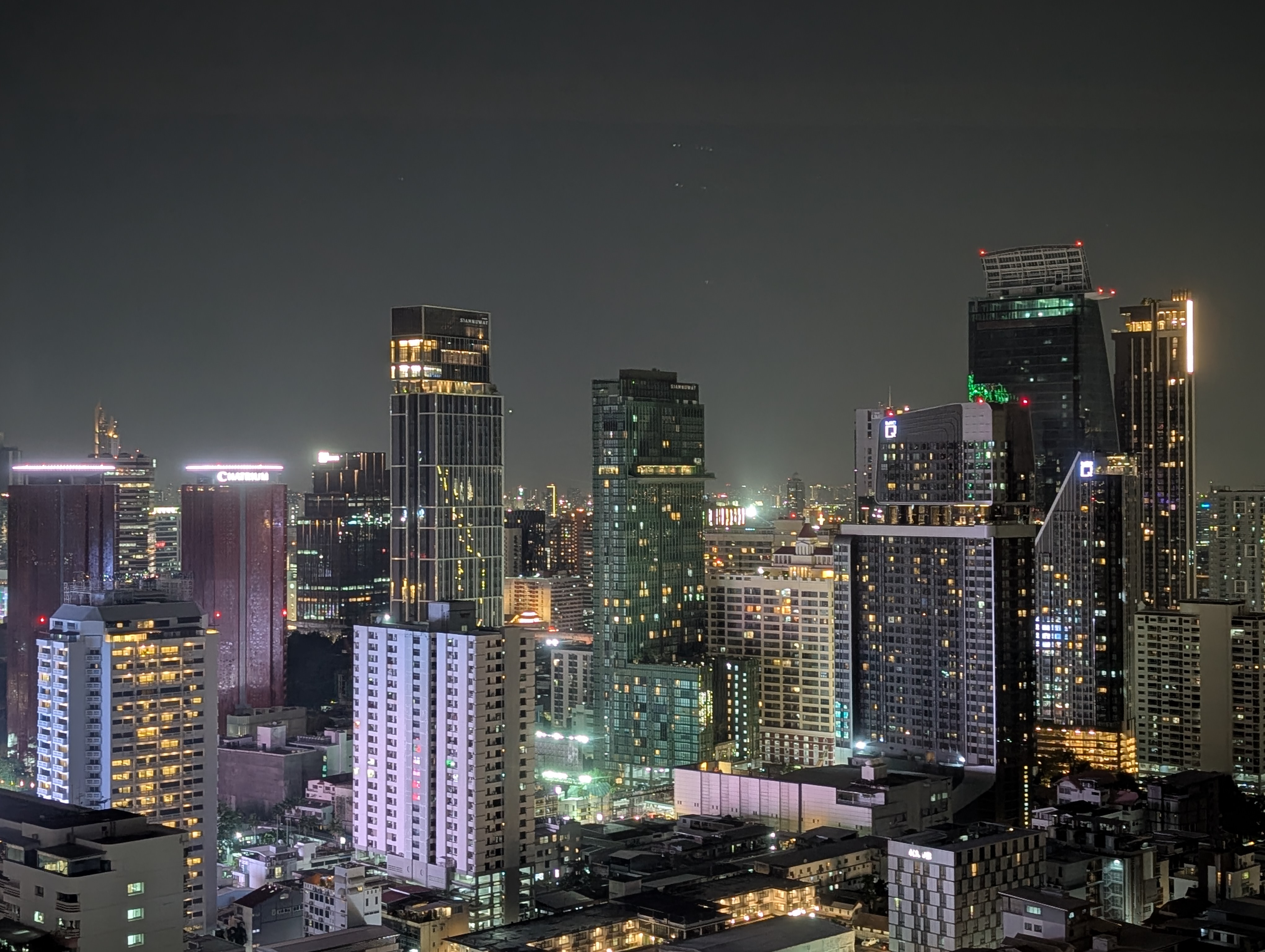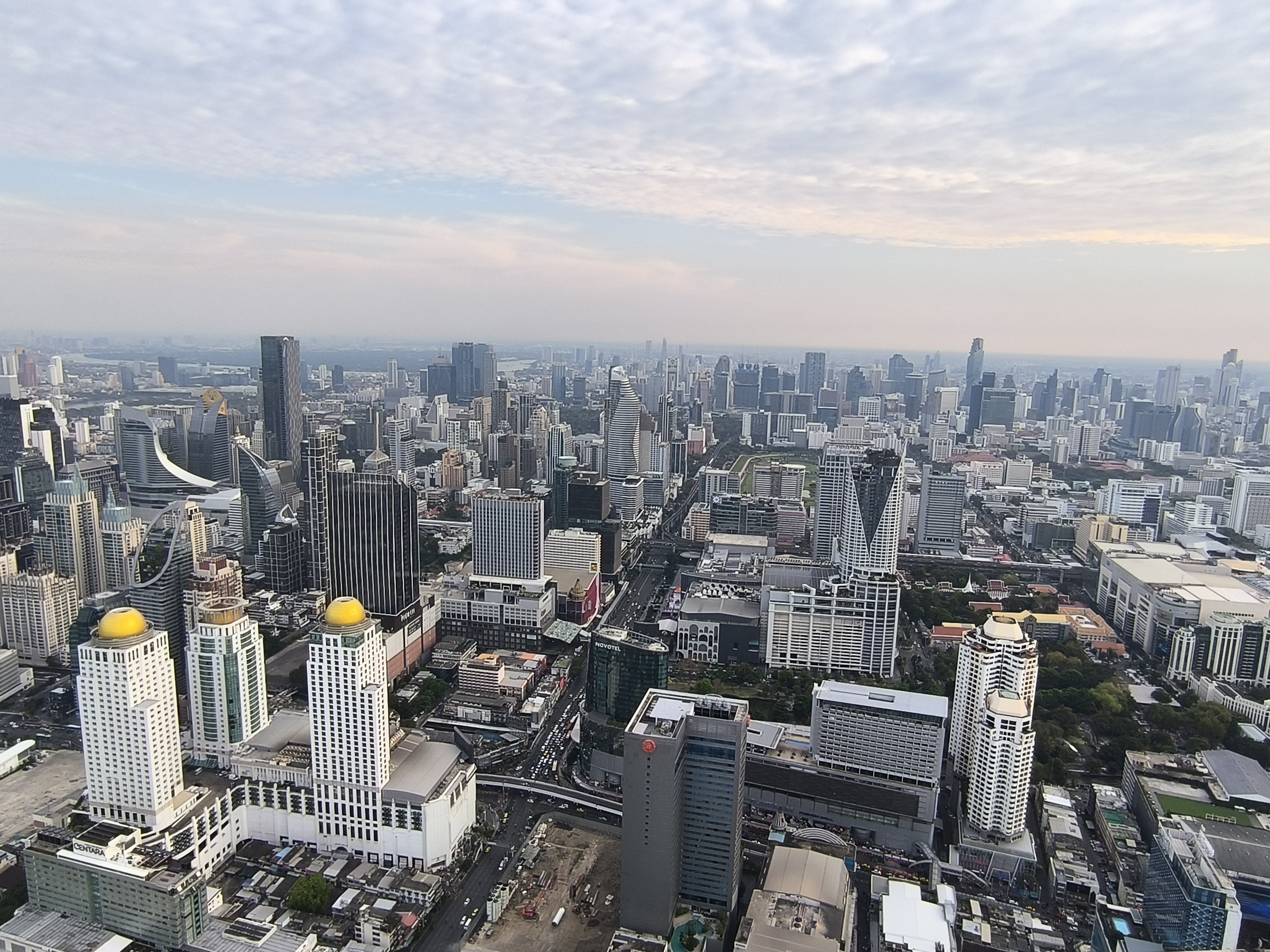 Was für ein Tag. 3:30 aus dem Bett und zum Flughafen in Colombo. Dann mit Verspätung abgeflogen und einen unruhigen, wackeligen Flug gehabt. Das habe ich erstmals so erlebt. Am Flughafen in Bangkok verlief alles völlig reibungslos. Kein Visum notwendig, rasche Abfertigung, unsere Koffer sind auch mit uns angekommen und das Taxi zum Hotel war ca. 10 Minuten nach Anruf da. Auf dem Weg Richtung Zentrum waren keine Hochhäuser zu sehen, doch je näher wir unserem Hotel kamen, desto höher wurden die Bauten. Unseres, das Baiyoke Sky Hotel ist mit seinen 84 Stockwerken sicher eines der höchsten. Wir wohnen im 30. Stock mit super Aussicht, aber ganz oben ist es unbeschreiblich, wie weit man sieht und zusätzlich dürfen wir einfach stehen bleiben und staunen, denn die Plattform rotiert langsam, und so bekommen wir einen ersten Eindruck von der Stadt aus der Adlerperspektive.