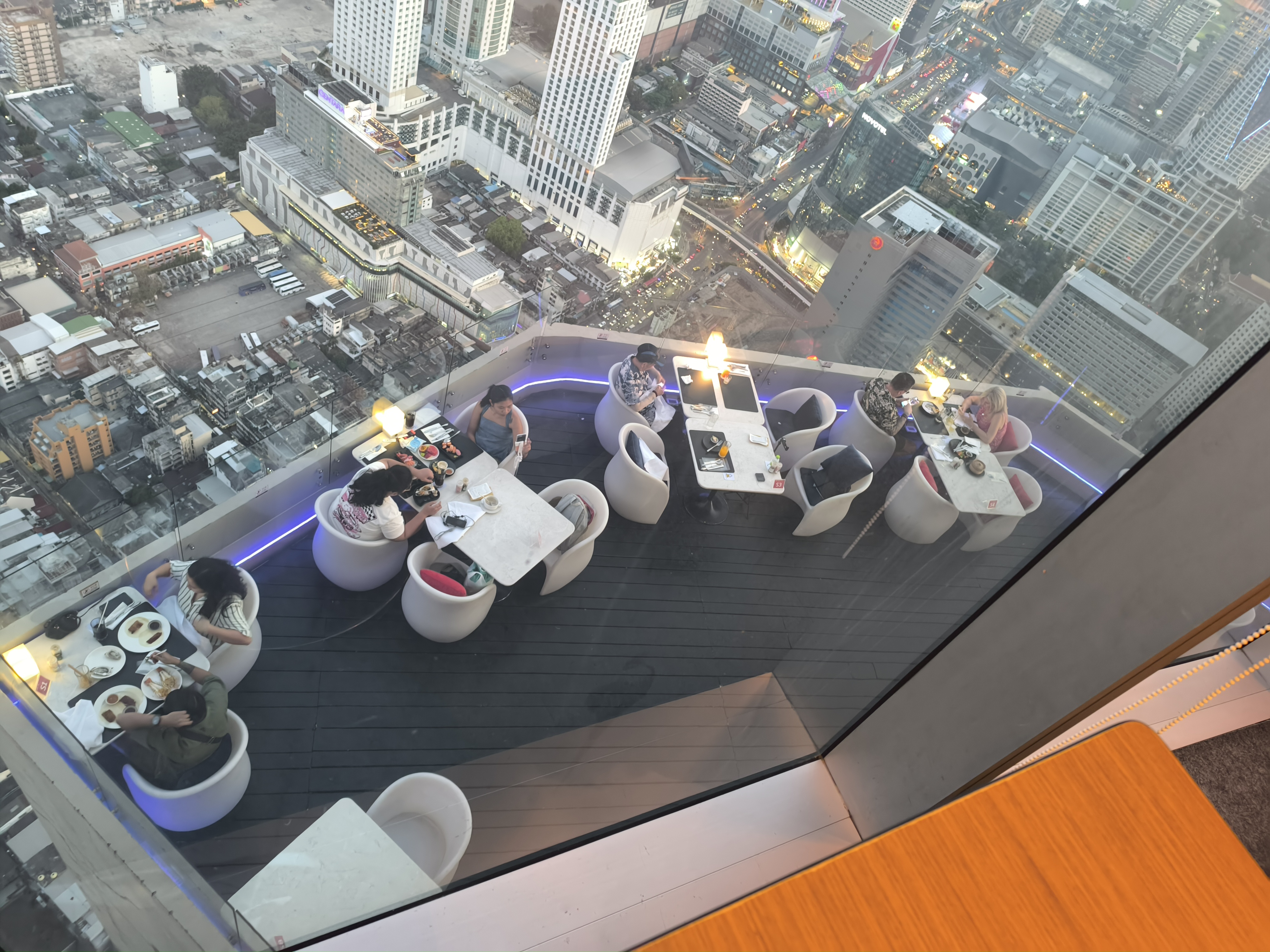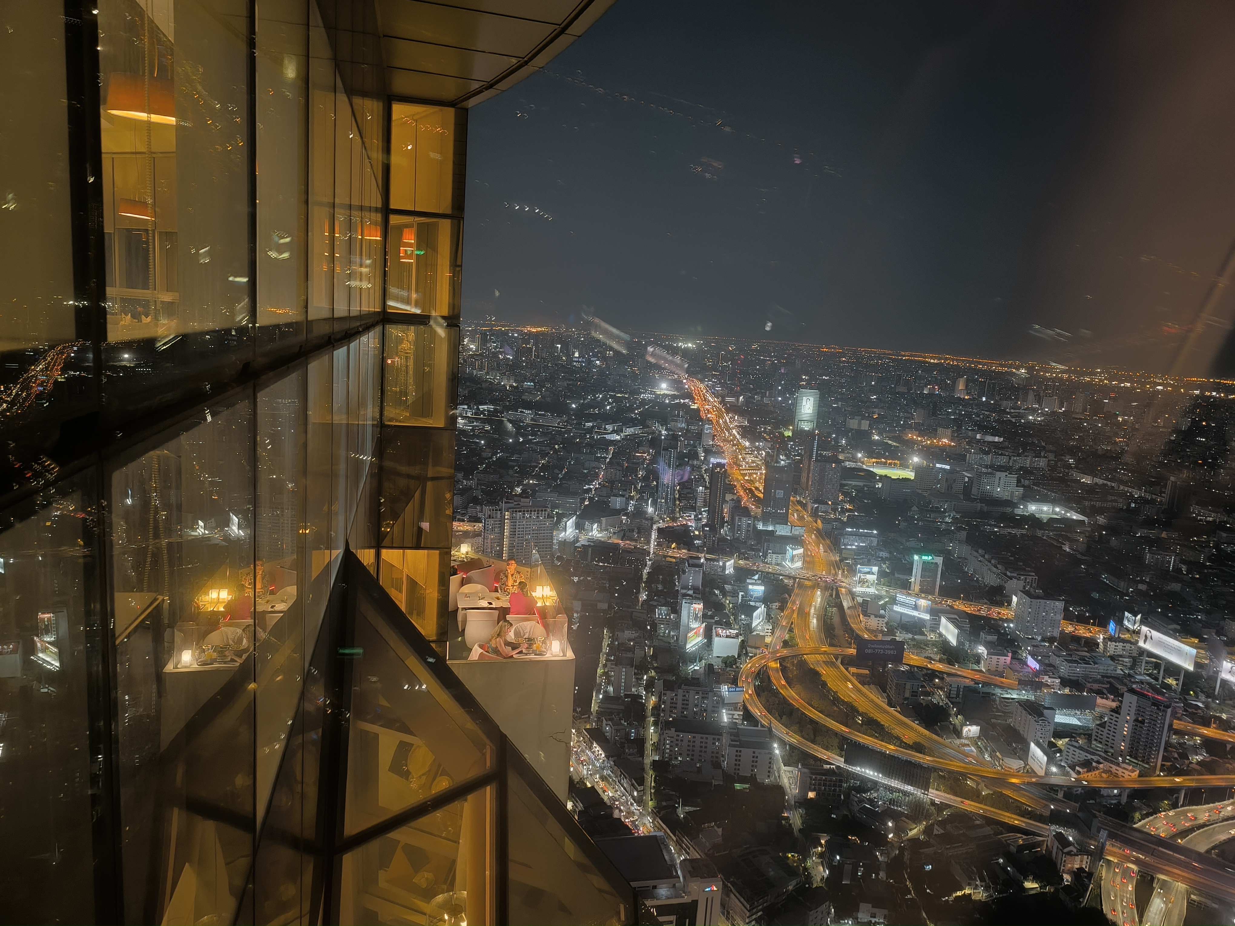 Heute speisen wir im 82. Stock, beginnend mit dem Sonnenuntergang bis zum völligen Einbruch der Nacht. Das erste Essen in Thailand wurde dem Ruf der thailändischen Küche gerecht und wir freuen uns schon auf die Köstlichkeiten, die noch auf uns zukommen werden.