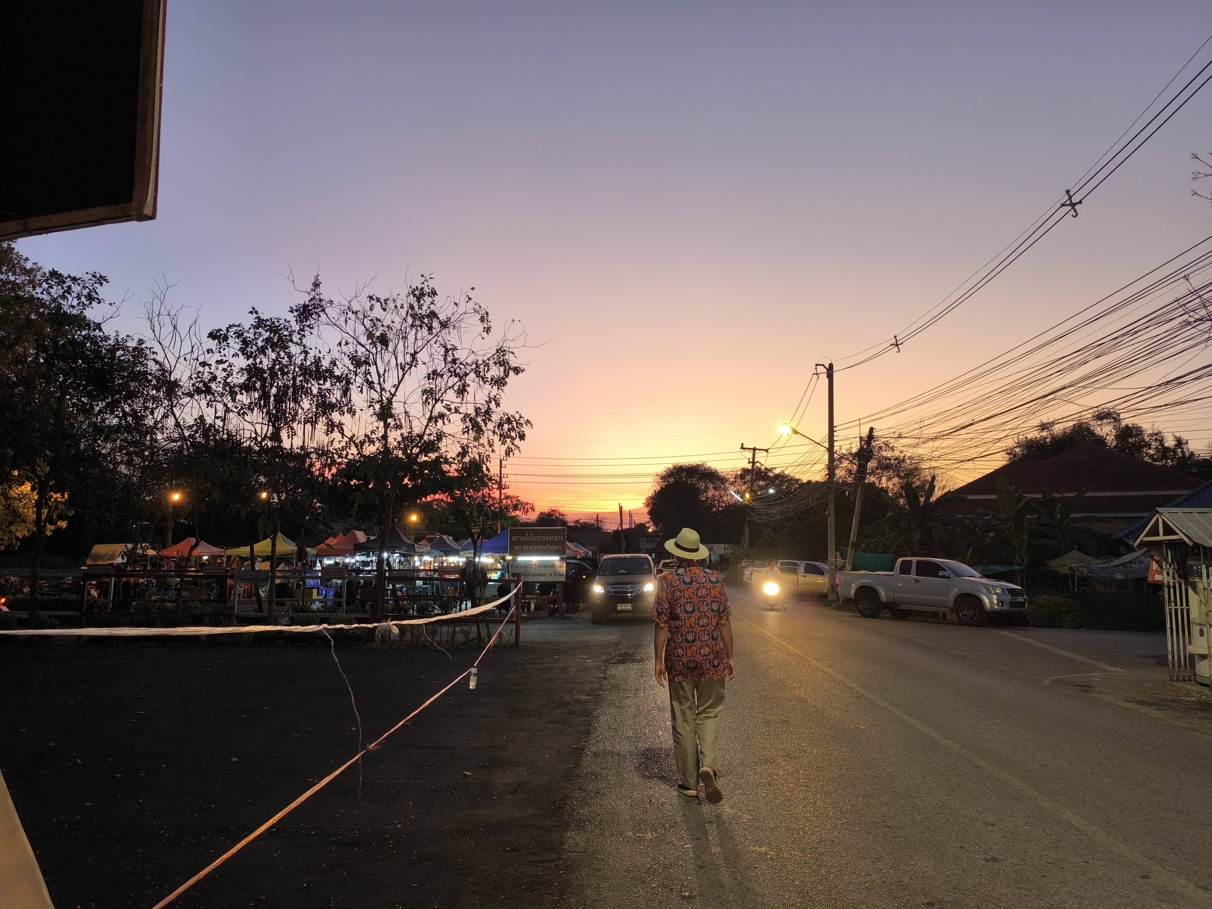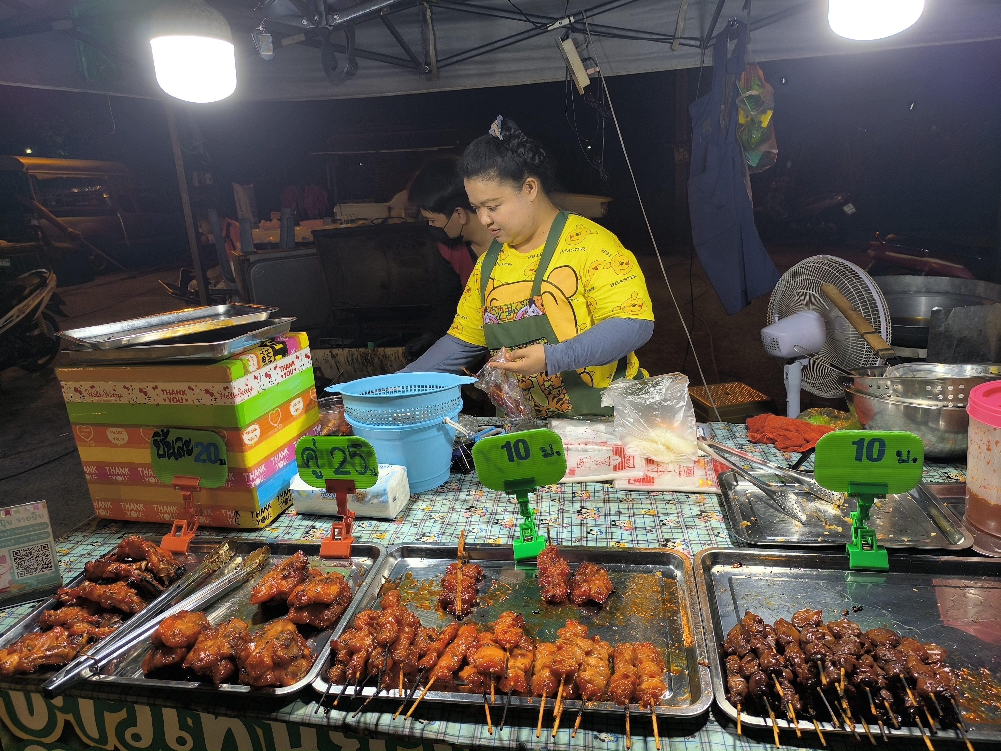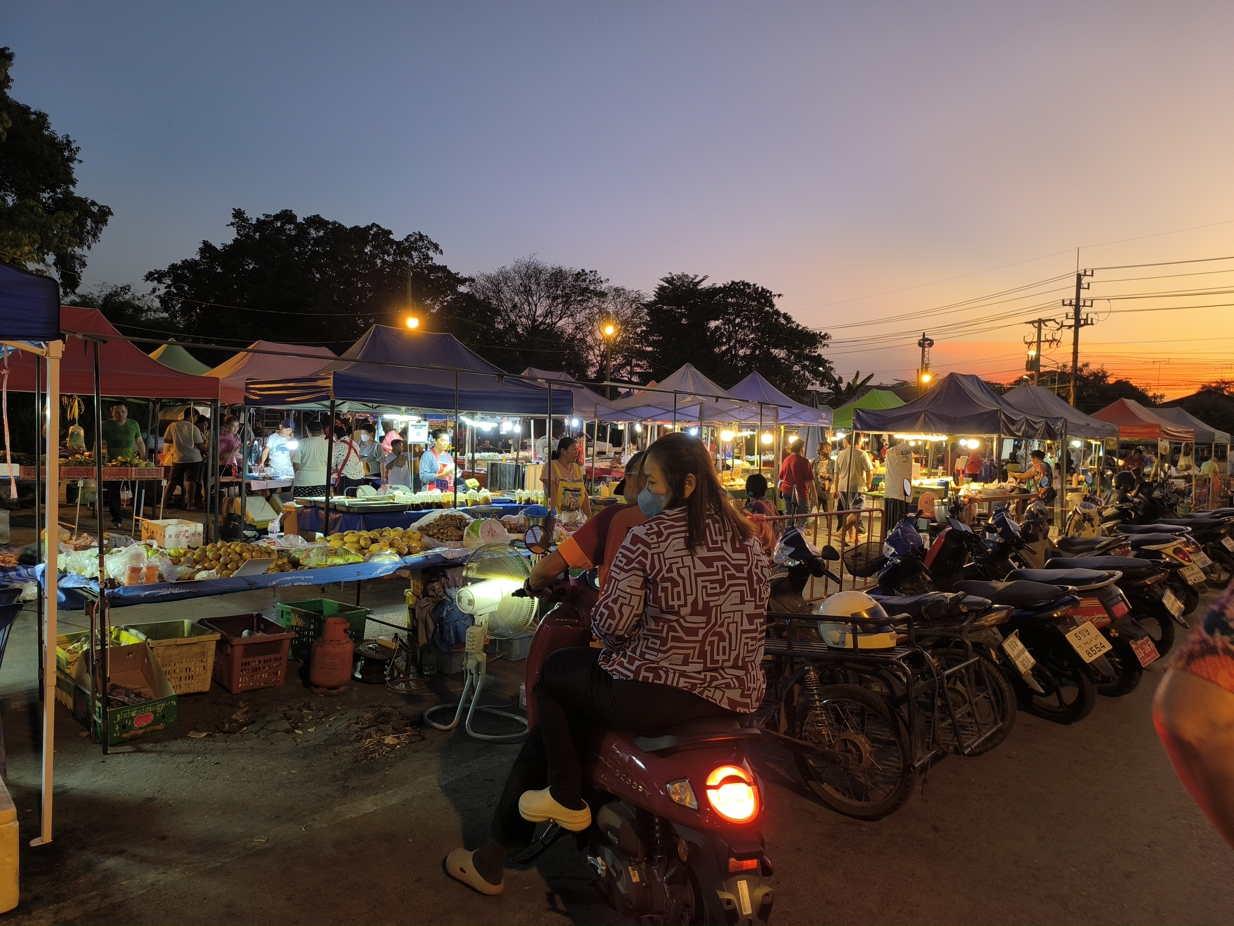 Wir kamen dann zu einem ganz kleinen Nachtmarkt, nachdem sich die Sonne zur Ruhe begeben hatte, wo ob der Düfte der Magen gleich ordentlich zu knurren begann. Wir bekamen abgepackten, gekochten Reis und Hühnerfleisch auf Spießchen, die ganz köstlich schmeckten und extra für uns nochmals über dem Grill heiß gemacht wurden. Ein wunderbares Abendessen.
